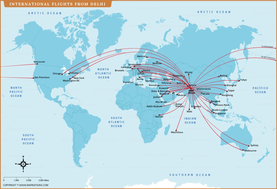 This map illustrates international flight routes from Delhi, highlighting major global destinations connected through Indira Gandhi International Airport. Curved lines radiate from Delhi to cities across Europe, Asia, North America, Africa, and Australia, demonstrating the capital’s role as a major aviation hub. Important destinations such as London, Dubai, Singapore, Tokyo, New York, and Sydney are clearly marked for easy reference.