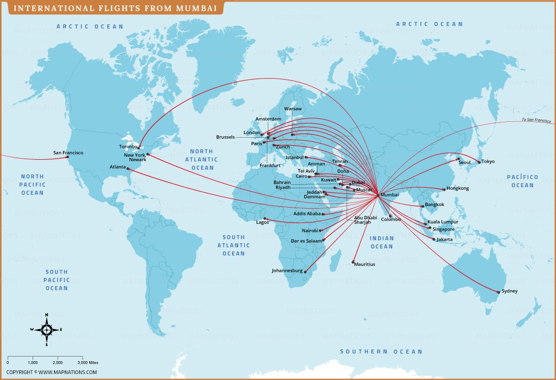 The map also emphasizes Mumbai’s role as a major aviation hub linking India with global markets and tourism centers. With labeled oceans, continents, and destination cities, it offers easy geographic understanding. This visual guide helps users quickly identify flight paths, travel regions, and international connectivity from Mumbai.