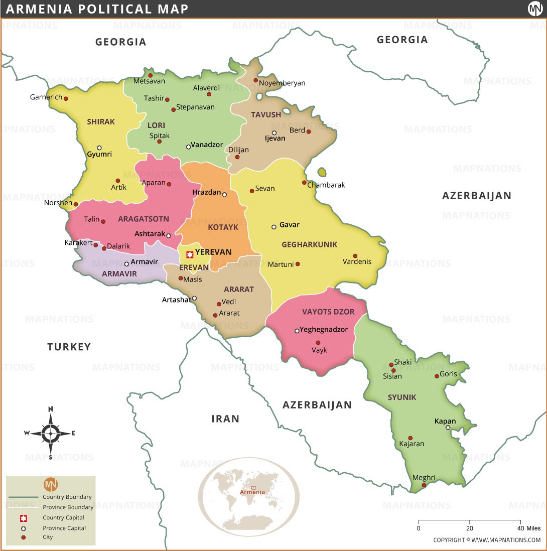 This political map of Armenia shows its 11 provinces, each of which is outlined and color-coded for easy identification. The smallest province is Yerevan, the capital city, which is located in the center and marked with a special symbol. In contrast, the largest province, Syunik, straddles Armenia's southern border with Iran. Other major provinces such as Ararat, Lori, and Gegharkunik are also labeled, as well as major cities such as Gyumri, Vanadzor, and Goris. Surrounding countries—Georgia, Azerbaijan, Iran, and Turkey—are shown, providing geopolitical context. The map includes a compass, scale bar, and inset globe to enhance navigation, making it ideal for educational, political, or reference purposes.