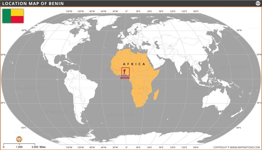 This location map of Benin highlights the country’s position in West Africa on a global world map. Benin is marked within the African continent, helping viewers easily identify its geographic placement relative to surrounding regions. The map provides global context by displaying continents, latitude and longitude lines, and major geographic boundaries. Benin lies along the Gulf of Guinea between Togo and Nigeria, with Niger and Burkina Faso to the north, making it an important part of West Africa.