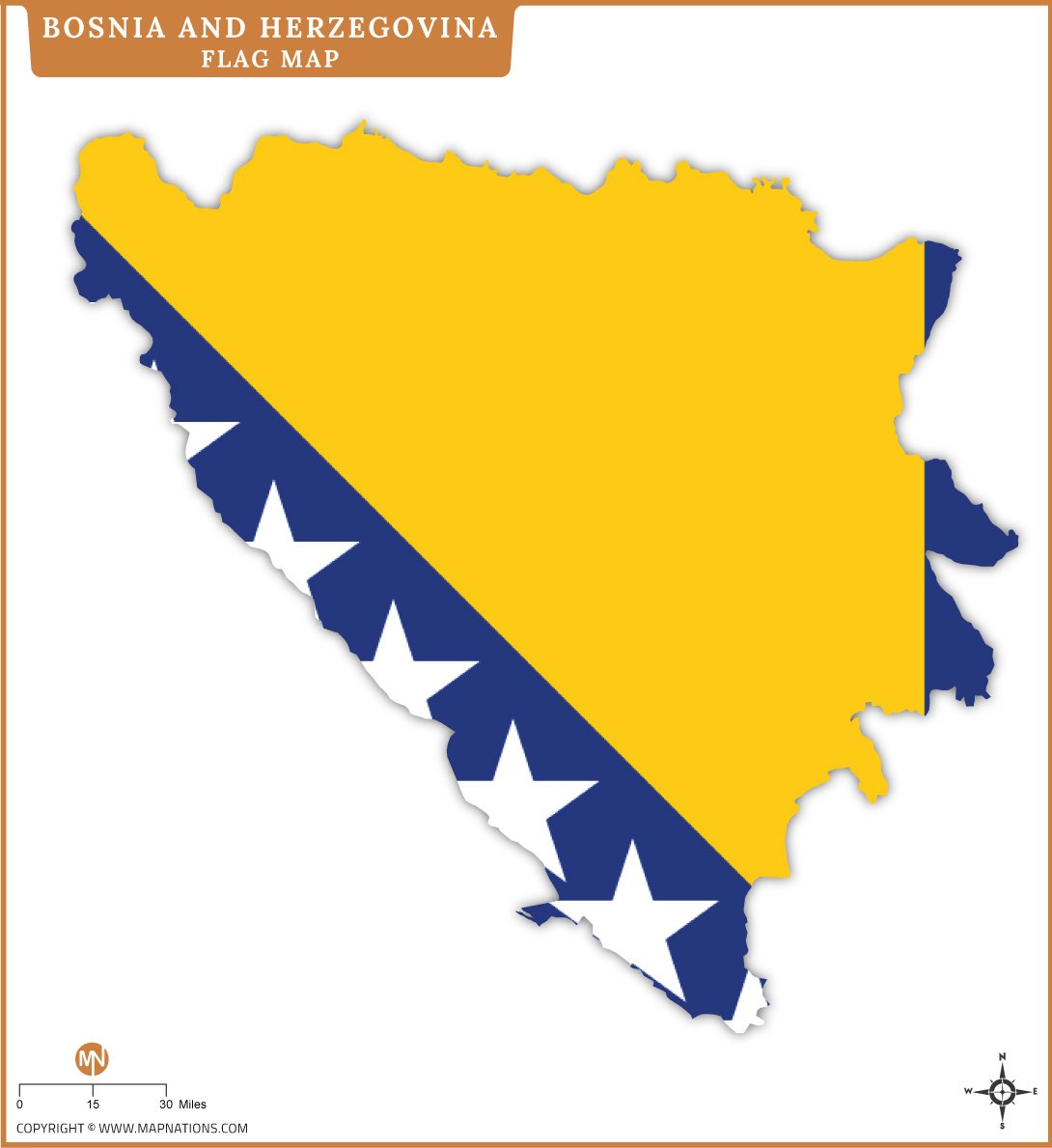 This Bosnia and Herzegovina flag map displays the country’s outline filled with the national flag design, combining geography with national symbolism. The map features the blue field, yellow triangle, and white stars that represent Europe and unity. It provides a visually striking representation of Bosnia and Herzegovina’s national identity while maintaining accurate country boundaries. Ideal for educational use, presentations, and general reference, this flag map helps viewers easily associate the nation’s territorial shape with its official flag and cultural significance.