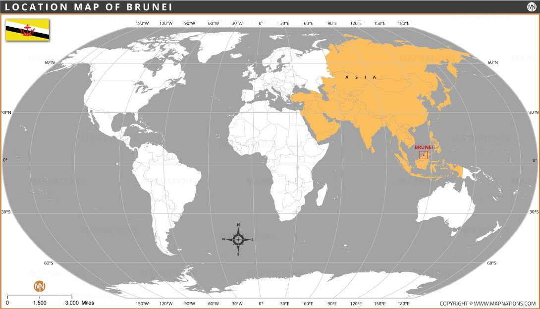 This location map of Brunei highlights its position in Southeast Asia on the island of Borneo. The country is clearly marked, showing its proximity to Malaysia and the South China Sea. The map provides a global perspective by displaying surrounding continents and regions, making it easy to understand Brunei’s geographical context. It is useful for students, travelers, and educators seeking a quick and clear reference to Brunei’s location in the world.
