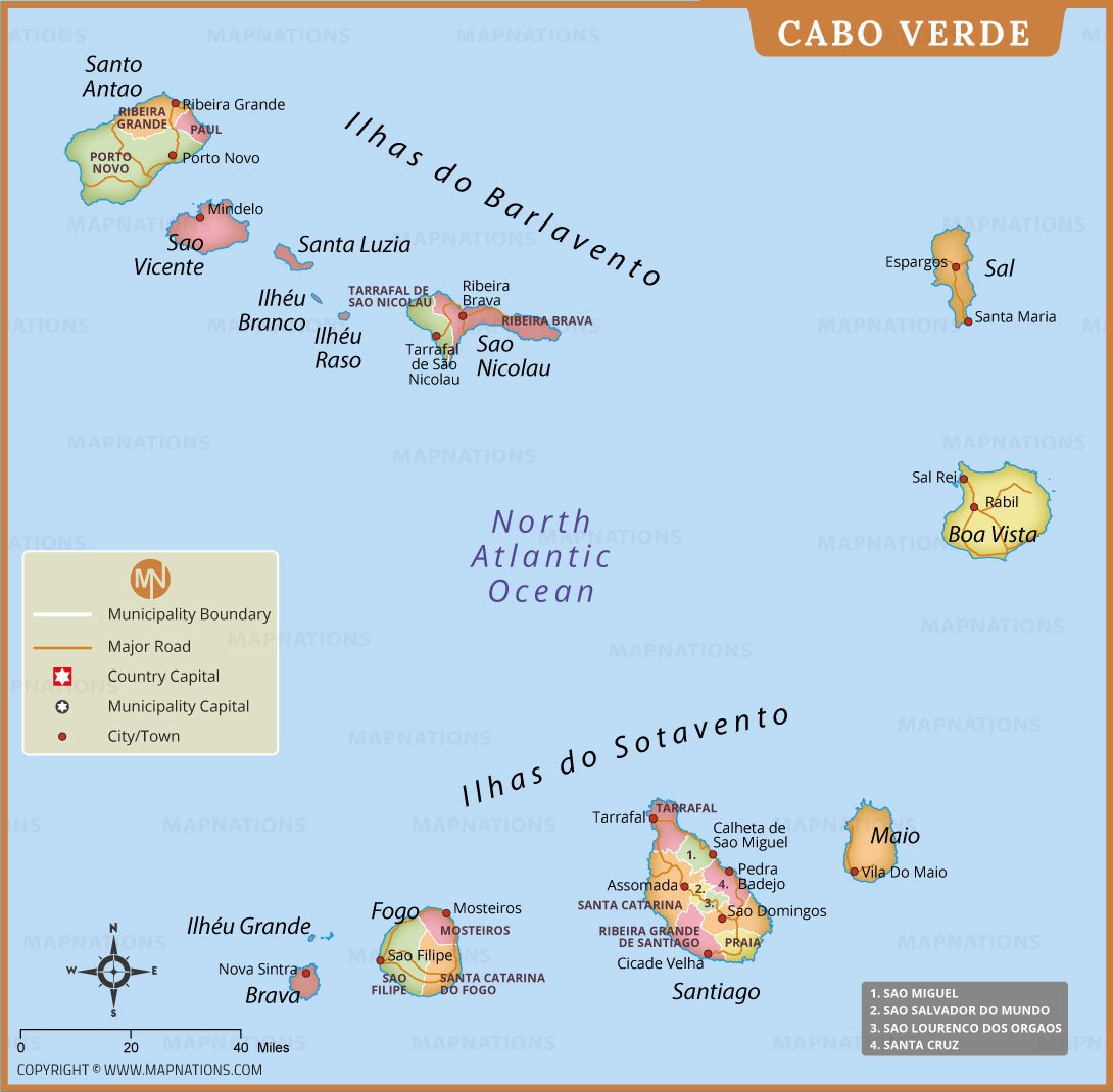 Map of Cabo Verde illustrates the full island nation in the North Atlantic Ocean, highlighting both the Barlavento and Sotavento island groups. It clearly marks major islands such as Santiago, São Vicente, Santo Antão, Sal, Boa Vista, Fogo, Maio, and Brava. Municipal boundaries, key cities, towns, and capital locations are carefully labeled for easy reference. Important road networks and administrative centers are also shown, making the map useful for education, travel planning, and geographic study. With clear typography and balanced color styling, this map provides an accurate visual overview of Cabo Verde’s political and physical layout.