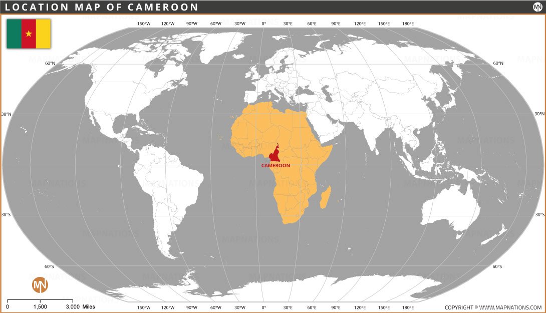 This location map clearly shows where Cameroon is situated in the world, highlighting the country within the African continent. Displayed on a global map projection, Cameroon appears in Central Africa along the Gulf of Guinea, bridging West and Central Africa. The map is useful for geographic reference, educational materials, presentations, and general understanding of Cameroon’s global and continental position in relation to other continents and oceans.
