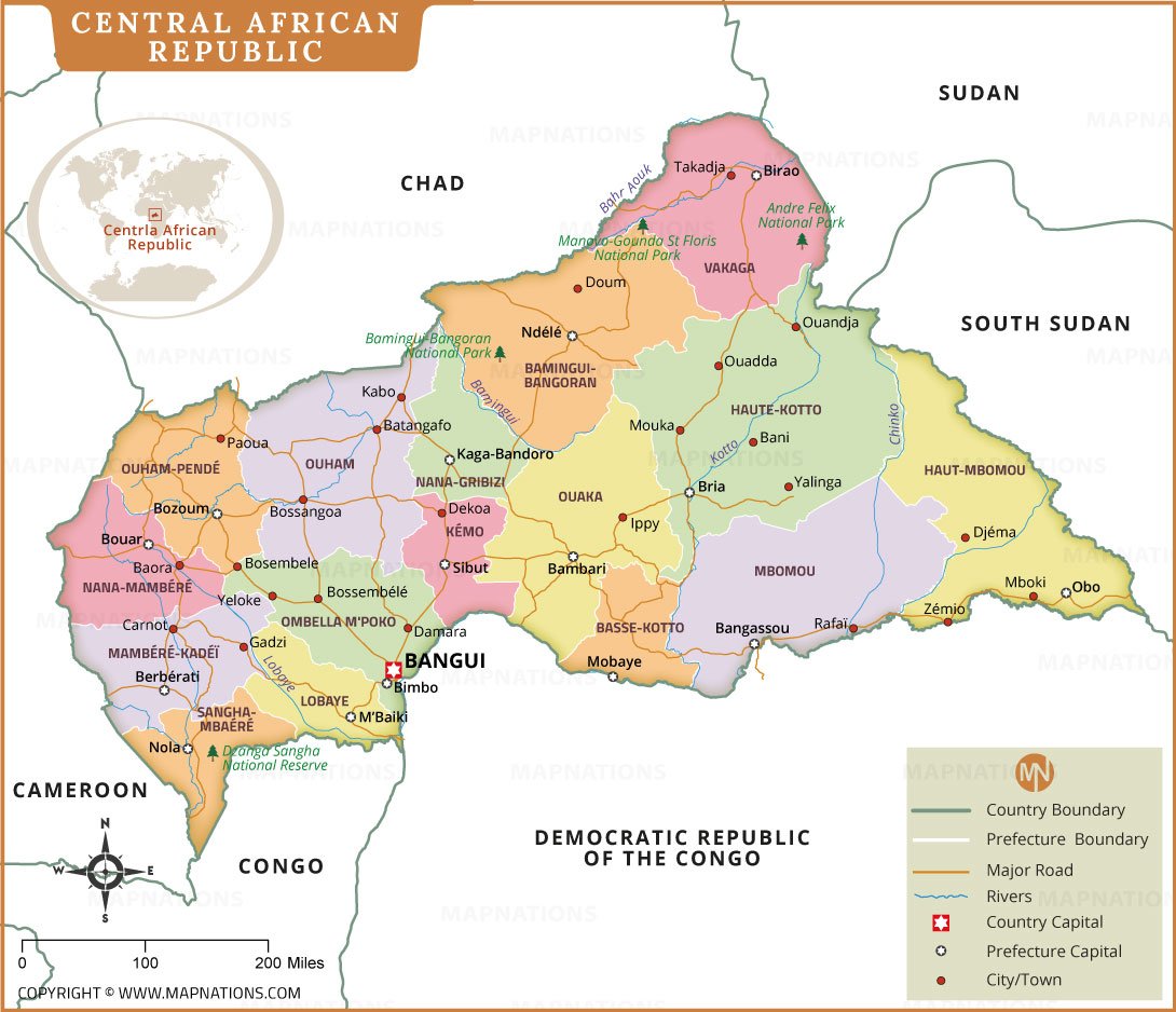 This detailed map of the Central African Republic presents administrative divisions, major cities, transport routes, rivers, and national parks in a clear layout. It highlights provincial boundaries, prefectures capitals, and the national capital Bangui, helping users understand political and geographic organization. Neighboring countries including Chad, Sudan, South Sudan, Cameroon, Congo, and the Democratic Republic of the Congo are clearly labeled. Major rivers and road networks support regional orientation. Ideal for education, research, travel planning, and cartographic reference, this map offers an accurate visual overview of Central Africa’s landlocked nation, with updated styling, balanced colors, and easy-to-read symbols throughout mapwide clarity.