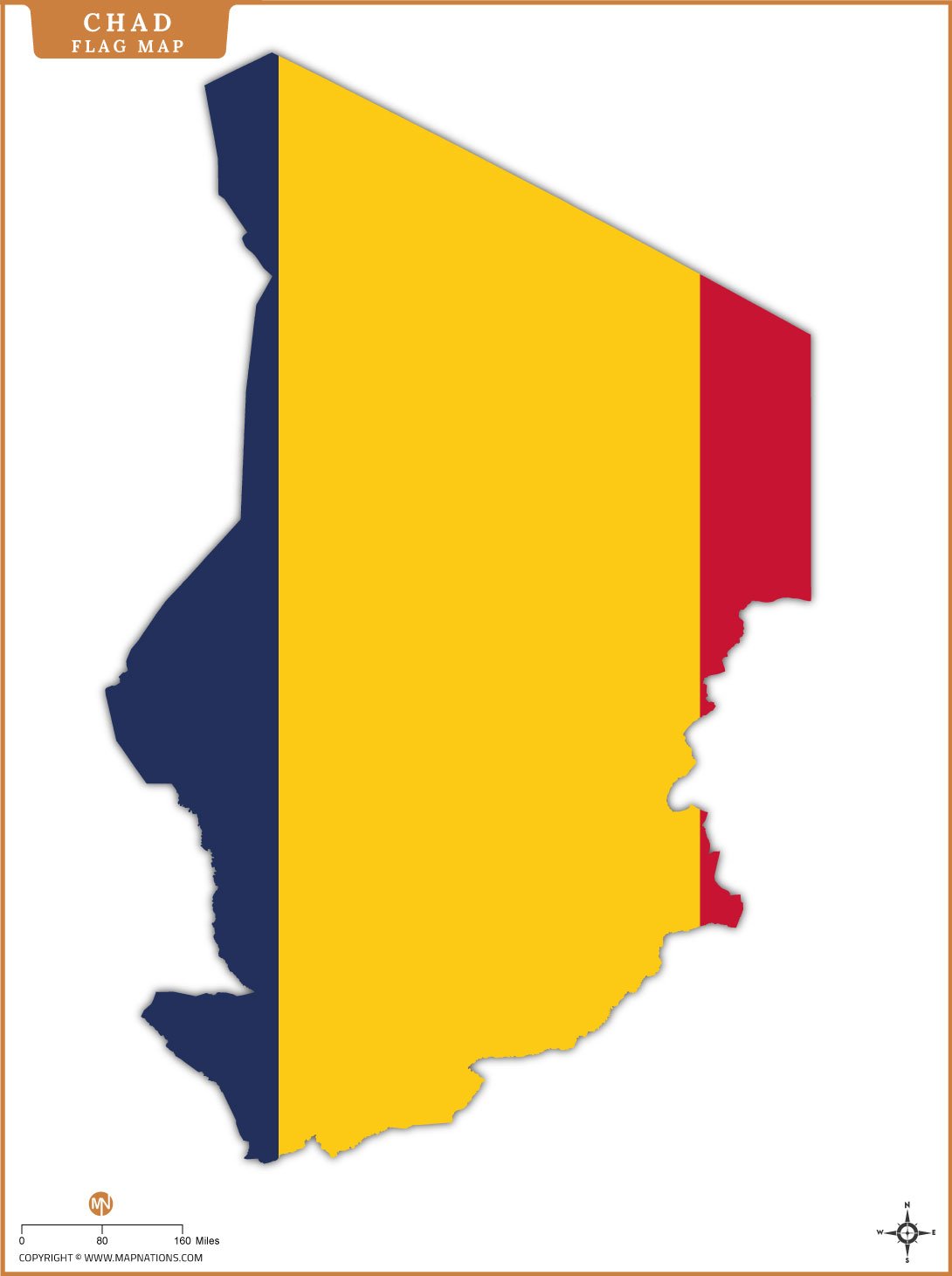 This Chad flag map displays the country outline filled with the blue, yellow, and red vertical tricolor of the national flag. It visually represents Chad’s identity, sovereignty, and geographic shape in a simple, recognizable format. Ideal for classrooms, websites, atlases, and presentations, the map supports learning about African nations and symbolism. Designers and educators can use this graphic for posters, digital content, and educational materials requiring a clean, modern, and culturally representative illustration today globally.