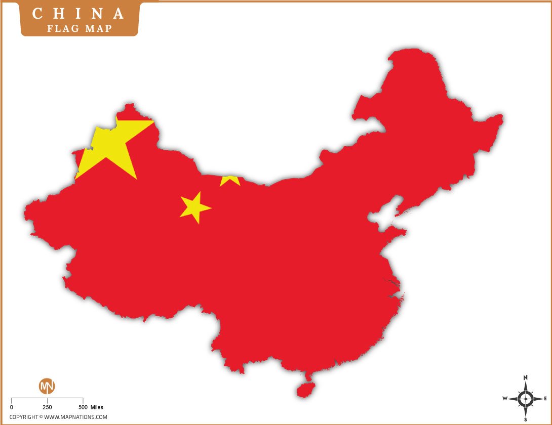 This flag map of China displays the country’s geographic outline filled with the iconic red and yellow design of the Flag of China. The large star and four smaller stars symbolize unity under the leadership of the Communist Party of China. Located in East Asia, China is one of the world’s largest countries by land area and population. This visual combines national symbolism with geographic representation, making it useful for educational, political, and cartographic reference purposes.
