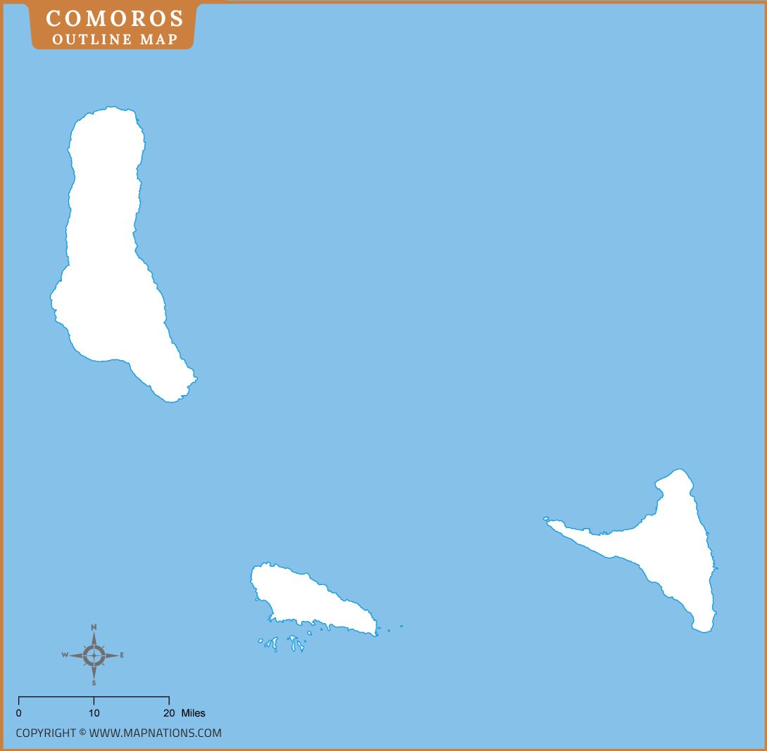 This blank outline map of Comoros features clearly defined regional boundaries, making it ideal for educational use, classroom assignments, and geography quizzes. Teachers can use it for printable worksheets, while students can label or color regions. It's also suitable for GIS users and researchers needing a clean, editable base map.