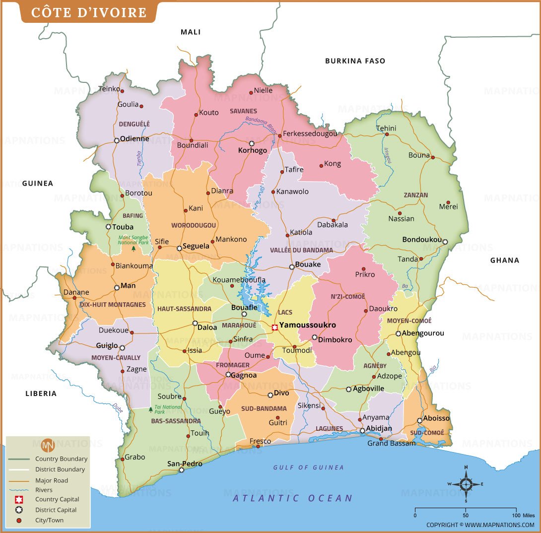 This detailed map of Côte d’Ivoire illustrates the country’s administrative regions, major cities, district capitals, and transportation networks. Clearly marked international borders highlight neighboring Mali, Burkina Faso, Ghana, Liberia, and Guinea. The map features key rivers, coastal areas along the Gulf of Guinea, and important road connections linking inland regions to coastal cities. Yamoussoukro, the national capital, is prominently identified, along with Abidjan and other major urban centers. Distinct color coding helps differentiate regions, making this map ideal for education, research, planning, and geographic visualization of Ivory Coast’s political structure.