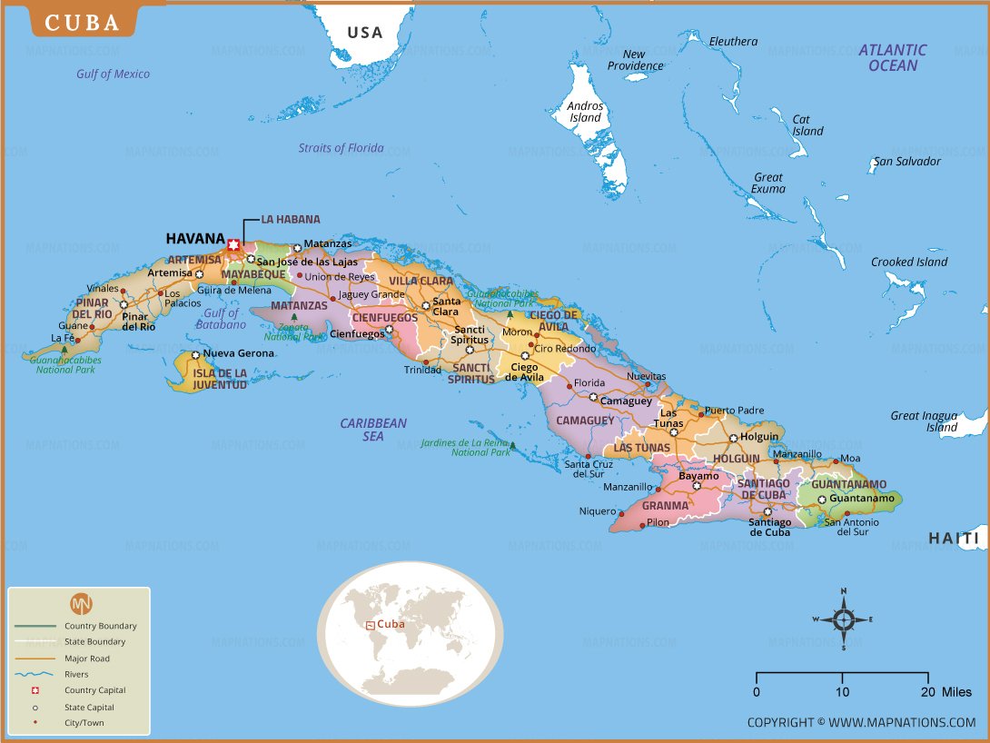 Map of Cuba highlights its provinces, major cities, rivers, and key geographic features. The country, located in the Caribbean Sea, is bordered by the Gulf of Mexico and the Atlantic Ocean. Havana, the capital city, is marked prominently on the northwestern coast, known for its colonial architecture and vibrant culture. Other significant cities include Santiago de Cuba, Camagüey, Holguín, and Cienfuegos. The map also shows Cuba’s surrounding islands such as Isla de la Juventud and nearby regions like Haiti and the Bahamas. Color-coded provinces make it easy to distinguish regional boundaries. This Cuba map provides a clear geographic overview, perfect for educational, travel, and reference purposes, showcasing the island nation’s political and physical layout in the Caribbean region.