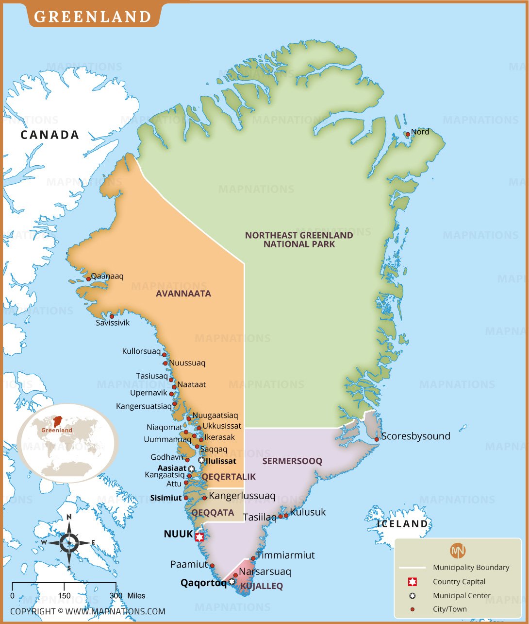 Map of Greenland shows the country's key administrative areas, key cities, and key geographic features. The island is divided into Avannaata, Qeqertalik, Kwektaa, Sermersooq, and Kujalleq, and also includes the world's largest protected area, Northeast Greenland National Park. Major settlements such as Nuuk, Ilulissat, Sisimiut, Qaqortoq, and Tasiilaq are clearly marked, helping viewers understand the population distribution along the coastline. The map also highlights fjords, surrounding seas, and Greenland's proximity to Canada and Iceland. With its color-coded regions and clear labels for towns, provincial capitals, and natural landmarks, this map provides an easy visual guide to Greenland's layout. It's great for educational use, geographic reference, or travel information about this Arctic country.