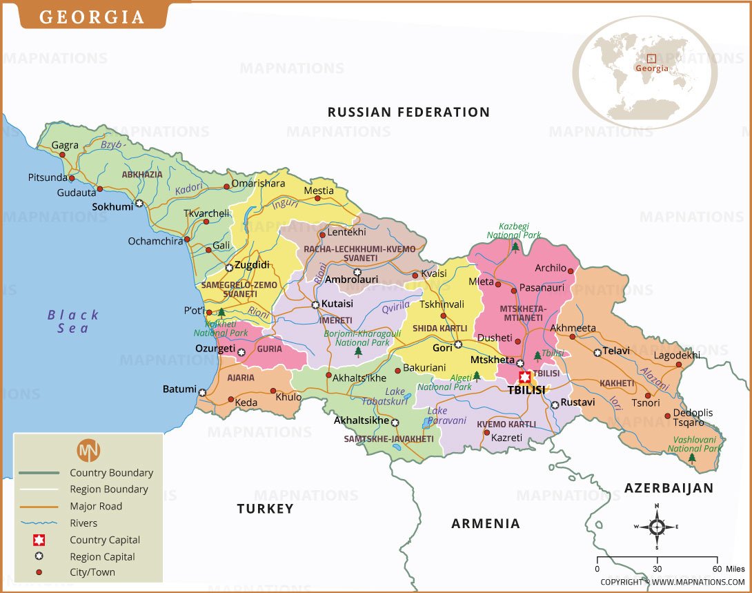 This detailed political map of Georgia highlights the country’s administrative regions, major cities, transportation routes, and natural features. It clearly displays international borders with Russia, Turkey, Armenia, and Azerbaijan, along with the Black Sea coastline. Important urban centers such as Tbilisi, Batumi, Kutaisi, Rustavi, and Gori are marked for easy reference. The map also illustrates rivers, national parks, highways, and regional capitals, making it useful for education, travel planning, research, and geographic studies. With clear labeling and accurate boundaries, this Georgia map provides an informative visual overview of the nation’s political and physical landscape.