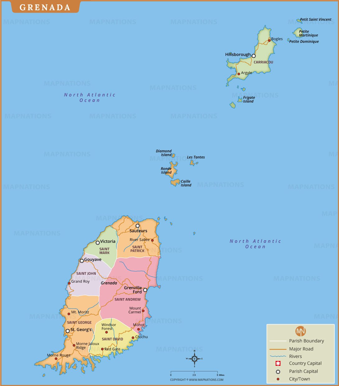 This detailed political map of Grenada illustrates the country’s administrative parishes, major towns, transportation routes, and surrounding islands. The map highlights parish boundaries including Saint George, Saint Andrew, Saint Patrick, Saint Mark, Saint John, and Saint David, along with key settlements such as St. George’s and Grenville. Major roads and rivers are clearly marked, providing geographic context and navigation insight. Offshore islands like Carriacou, Petite Martinique, and nearby smaller islands are also displayed, emphasizing Grenada’s island geography in the Caribbean Sea. Designed for educational, travel, and reference purposes, this map offers a clear and accurate overview of Grenada’s political and physical layout.