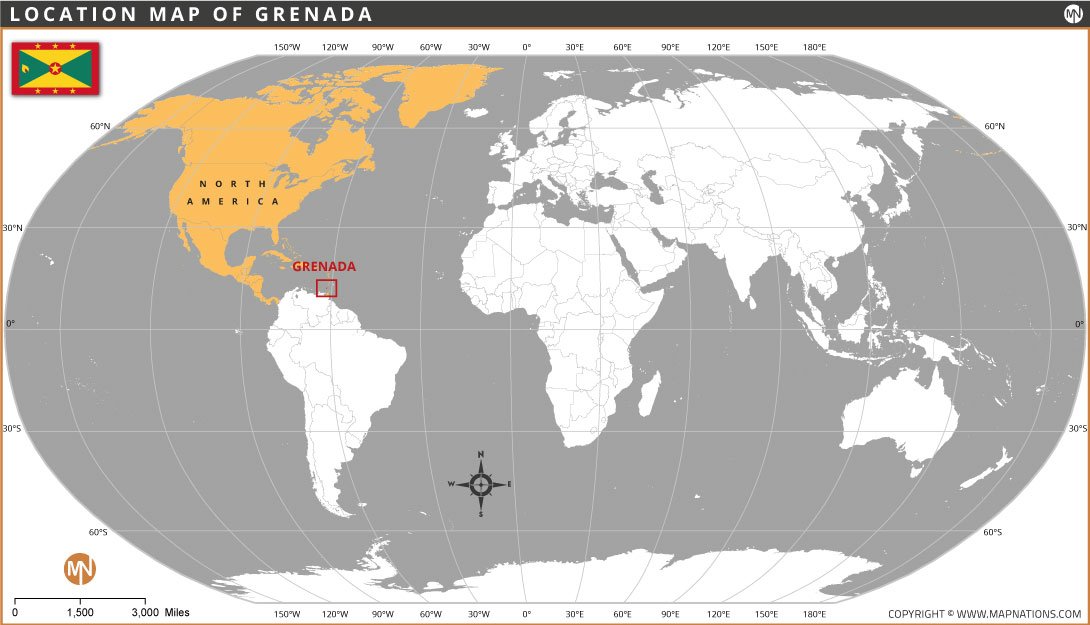 This location map of Grenada shows the country’s position within the Caribbean region on a global world map. Grenada is clearly highlighted, helping viewers understand its geographic placement relative to North America, South America, and surrounding oceans. The map provides a broad spatial perspective, making it useful for educational, geographic, and reference purposes. Its clean layout and clear labeling allow easy identification of Grenada’s location in the southeastern Caribbean Sea.