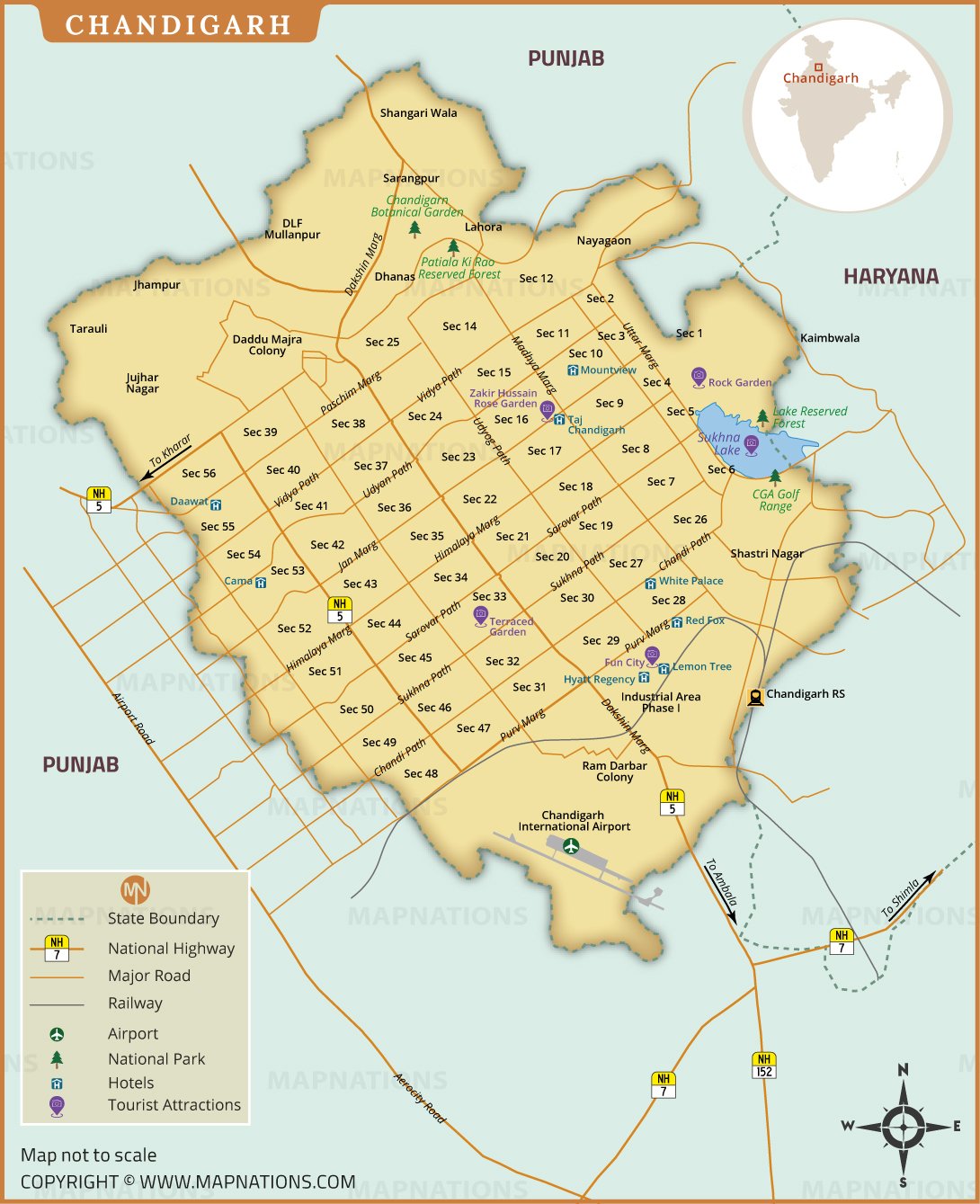 Map of Chandigarh provides a clear overview of the city’s planned sector layout, major roads, highways, and important landmarks. It highlights key areas such as Sukhna Lake, Rock Garden, Rose Garden, Industrial Area, and Chandigarh International Airport. The map also marks railway lines, hotels, tourist attractions, reserved forests, and golf ranges for easy navigation. State boundaries with Punjab and Haryana are clearly shown, along with national highways connecting Chandigarh to nearby cities. Ideal for students, travelers, planners, and researchers, this map helps understand Chandigarh’s urban structure, transport network, and geographical location within northern India.