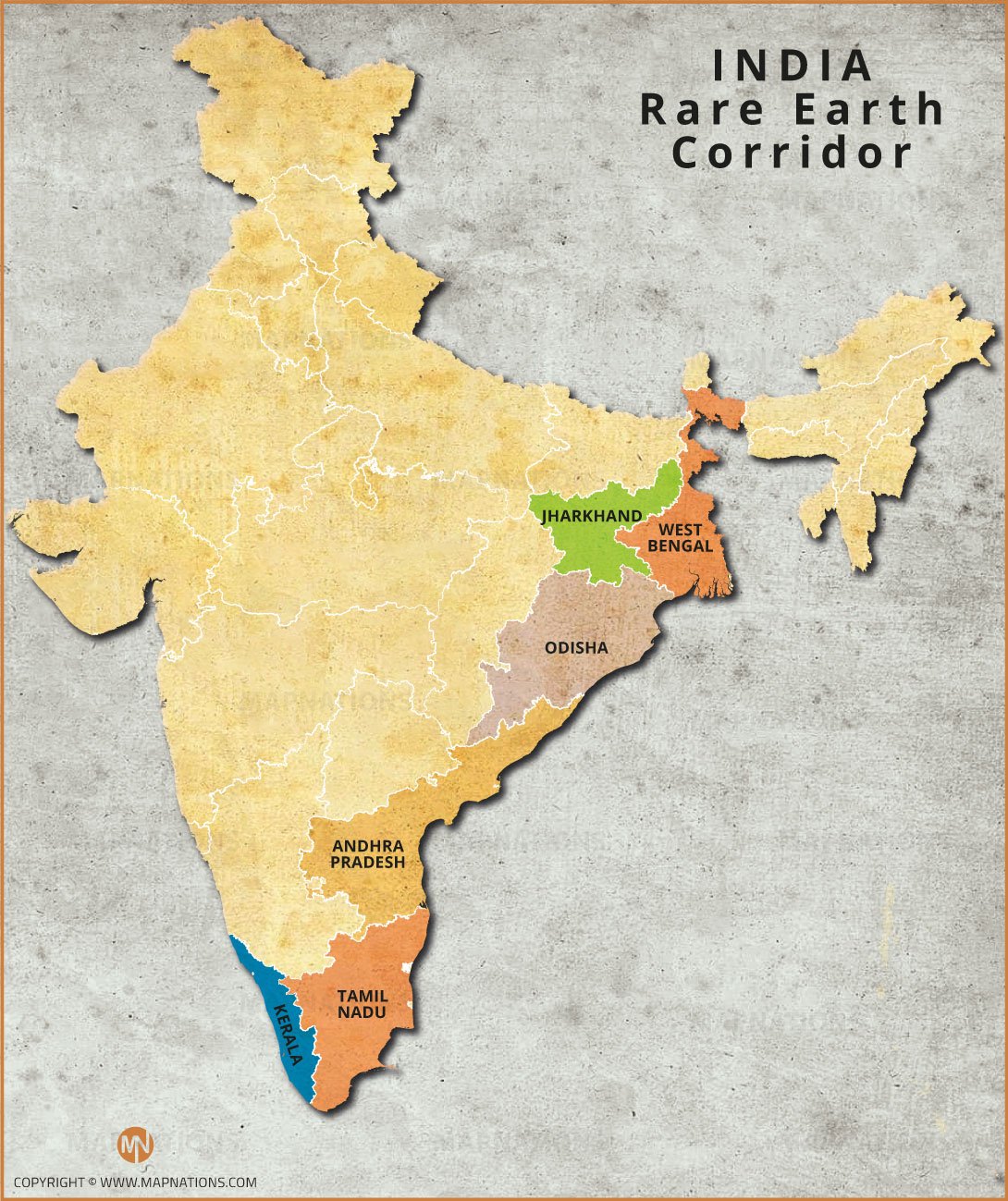 This map illustrates India’s Rare Earth Corridor, highlighting key mineral-bearing states including Jharkhand, West Bengal, Odisha, Andhra Pradesh, Tamil Nadu, and Kerala. The corridor represents strategically important coastal and inland zones containing monazite sands and other rare earth element deposits. These resources support electronics, renewable energy technologies, defense manufacturing, and advanced industries. The visualization helps researchers, policymakers, and investors understand regional distribution patterns and exploration potential while promoting responsible mining practices and sustainable development goals.