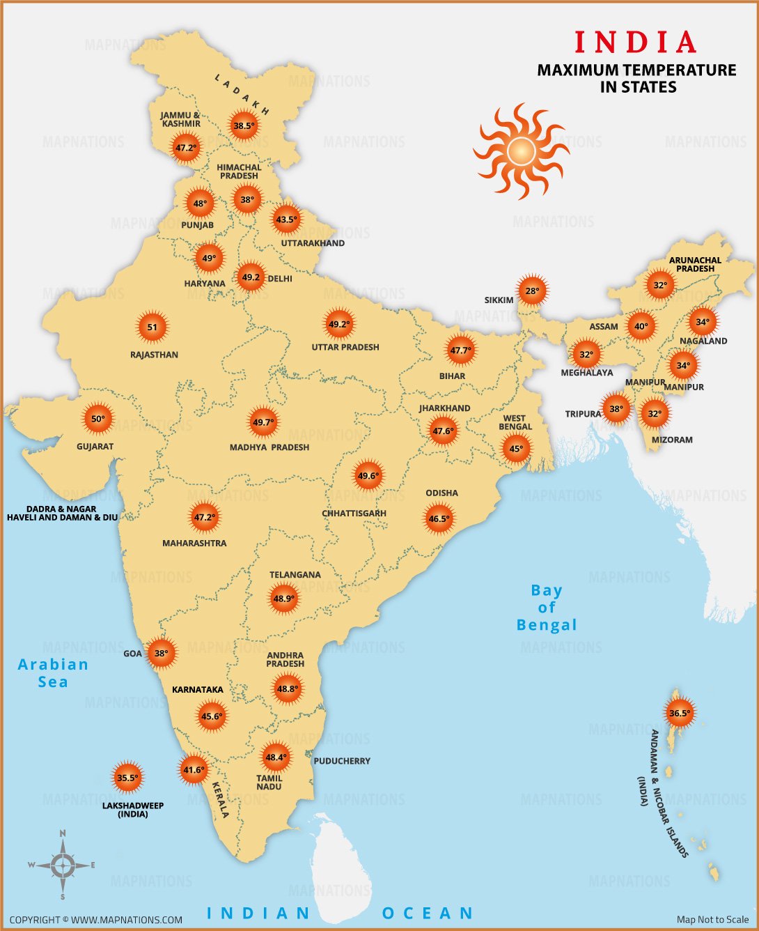 In contrast, southern and coastal states like Kerala, Goa, and Tamil Nadu record comparatively lower maximum temperatures due to strong maritime influence, though humidity remains high. Northeastern and Himalayan states, including Sikkim and Arunachal Pradesh, maintain cooler conditions throughout the year. This map is useful for understanding India’s climate diversity, heatwave patterns, and regional temperature variations for educational and geographic reference purposes.