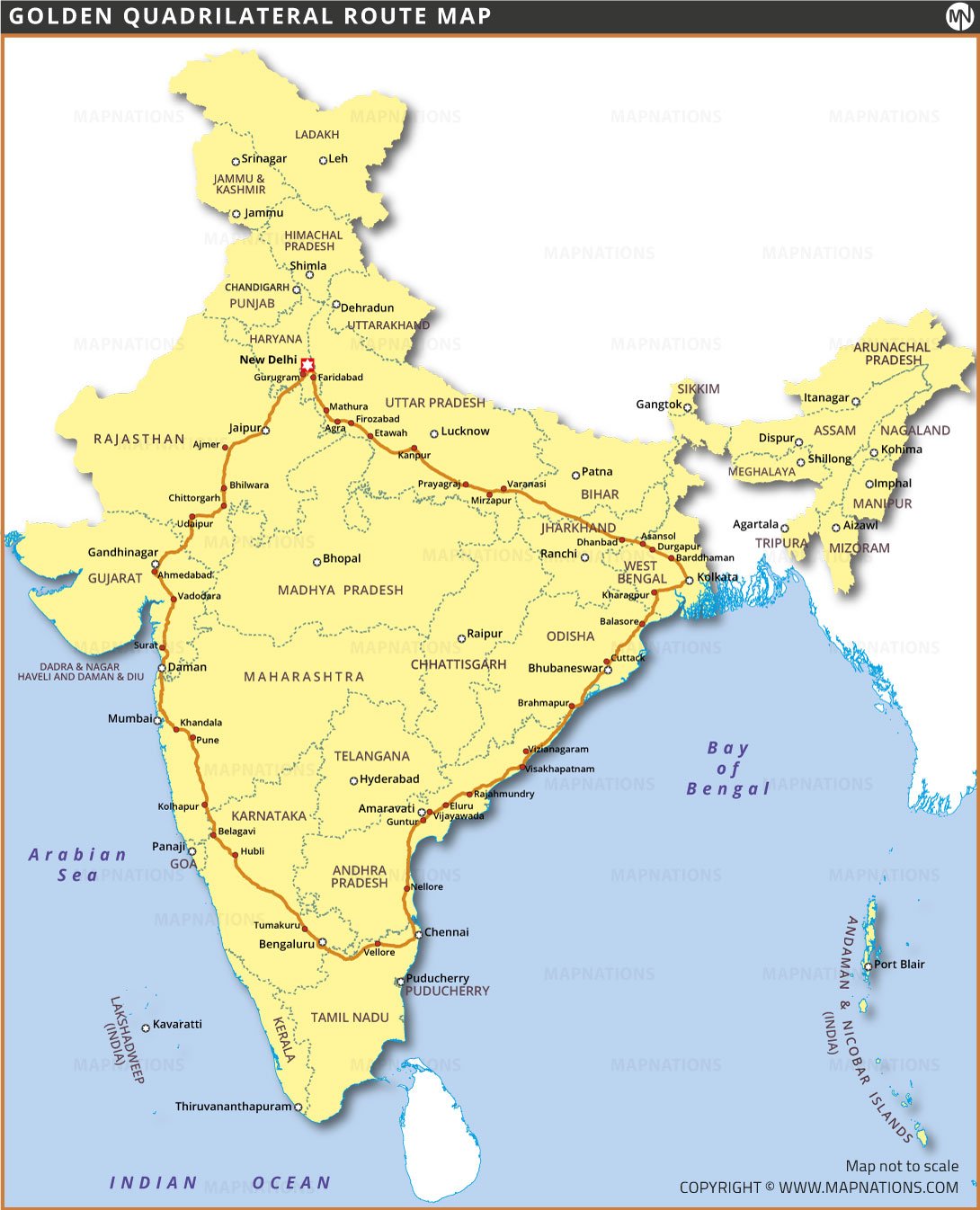 The Golden Quadrilateral Route Map of India highlights the national highway network connecting Delhi, Mumbai, Chennai, and Kolkata. This strategic highway project connects major cities and states, boosting connectivity, trade, and travel across the country. This map shows the entire route passing through Rajasthan, Gujarat, Maharashtra, Karnataka, Tamil Nadu, Andhra Pradesh, Odisha, West Bengal, Bihar, Uttar Pradesh, and Haryana. It is a valuable reference for travelers, students, researchers, and professionals studying India's road transportation system.