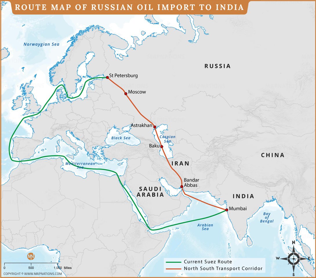 This map illustrates the major transportation routes used for Russian oil exports to India. It highlights two key pathways: the traditional maritime route through the Mediterranean Sea, Suez Canal, Red Sea, and Arabian Sea to Mumbai, and the shorter International North–South Transport Corridor (INSTC). The corridor connects Russia through cities such as St. Petersburg, Moscow, and Astrakhan, then passes via Baku and Iran to Bandar Abbas before reaching India. By combining rail, road, and sea transport, the INSTC significantly reduces travel distance and shipping time compared to the conventional Suez route. The map provides geographic context for strategic energy trade links between Russia, Iran, and India.