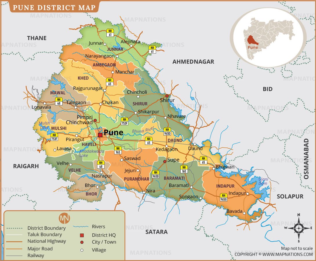 This detailed Pune District map highlights administrative taluks, major towns, transport routes, rivers, and surrounding district boundaries in Maharashtra. It clearly marks national highways, railways, important settlements, and district headquarters for better geographic understanding. The map is useful for students, travelers, planners, and researchers seeking accurate spatial reference of Pune’s diverse regions. It also supports regional development analysis, infrastructure planning, tourism navigation, and educational use with clear cartographic representation and labeled features.