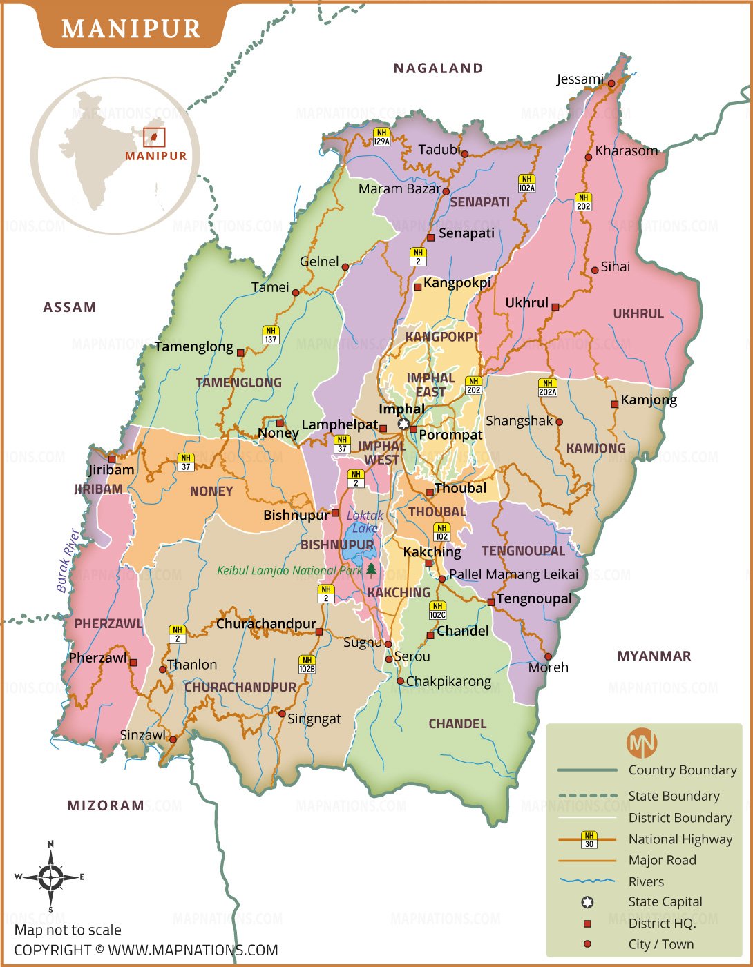 This detailed district map of Manipur presents a clear view of the state’s administrative divisions, major towns, road networks, and natural features. Located in Northeast India, Manipur shares borders with Nagaland, Assam, Mizoram, and Myanmar. The map highlights all districts, including Imphal East and West, Thoubal, Bishnupur, Churachandpur, Ukhrul, Senapati, Tamenglong, Chandel, Kangpokpi, Tengnoupal, Kamjong, Noney, Jiribam, and Pherzawl. Important national highways, rivers, district headquarters, and Imphal as the state capital are clearly marked, making this map useful for education, reference, and planning.
