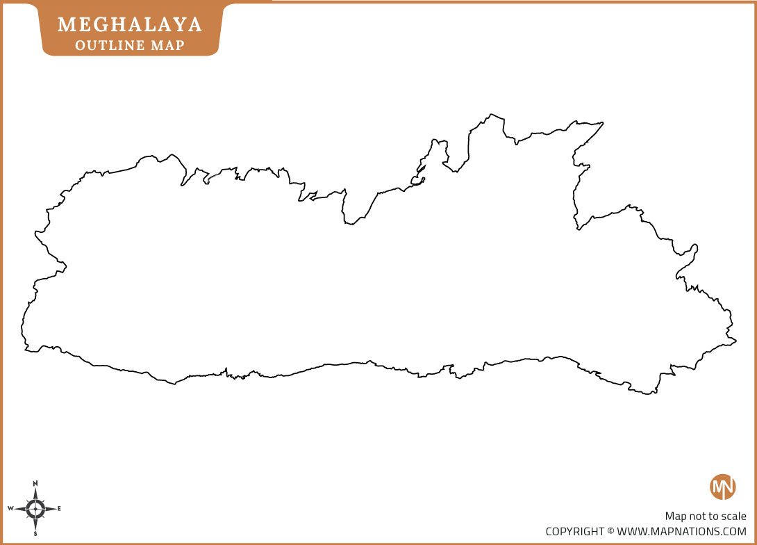 Meghalaya maps provide essential resources for educational, administrative, and geographic purposes. The outline map shows the state's outer boundary, ideal for drawing or marking locations. The blank map displays district divisions, aiding in detailed study, district identification, and custom map creation for classroom or research use.