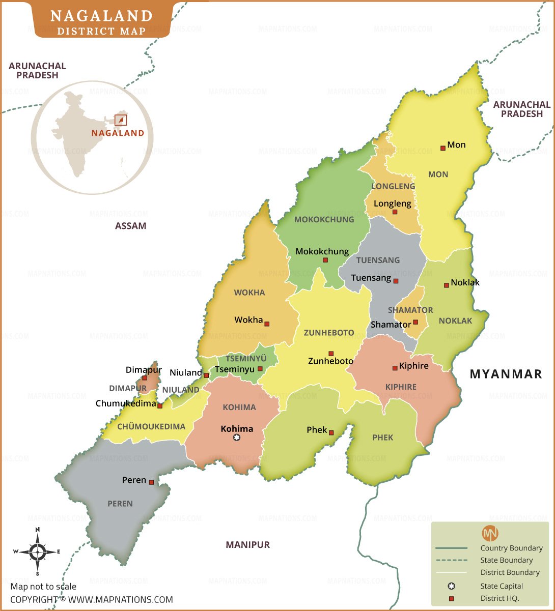 Nagaland district map shows the administrative boundaries and major locations across the state. It clearly shows the state capital Amaravati as well as all district headquarters and major towns. This map also shows important geographical divisions, making it useful for students, researchers and travelers. With different colors for each district, it provides a simple and clear understanding of the administrative set-up and regional distribution of Nagaland. This map is ideal for educational, planning and reference purposes.