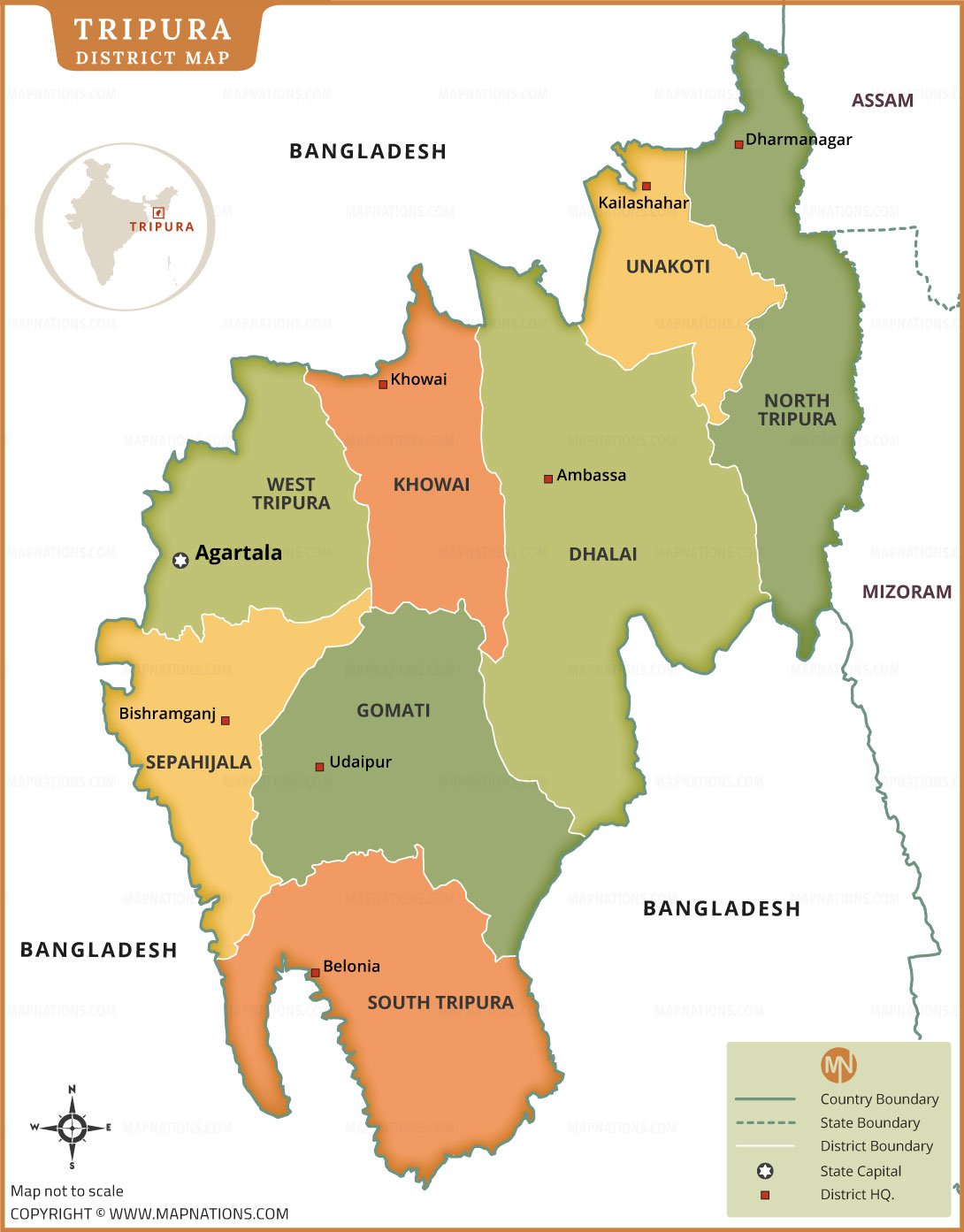 This Tripura district map presents a clear view of the state’s administrative divisions and district headquarters. It shows all eight districts—West Tripura, Sepahijala, Khowai, Gomati, South Tripura, Dhalai, Unakoti, and North Tripura—highlighted in distinct colors for easy identification. The map also marks the state capital Agartala, major district headquarters, and neighboring regions including Bangladesh, Assam, and Mizoram. Designed for educational and reference use, it helps users understand Tripura’s administrative structure and geographic layout effectively.