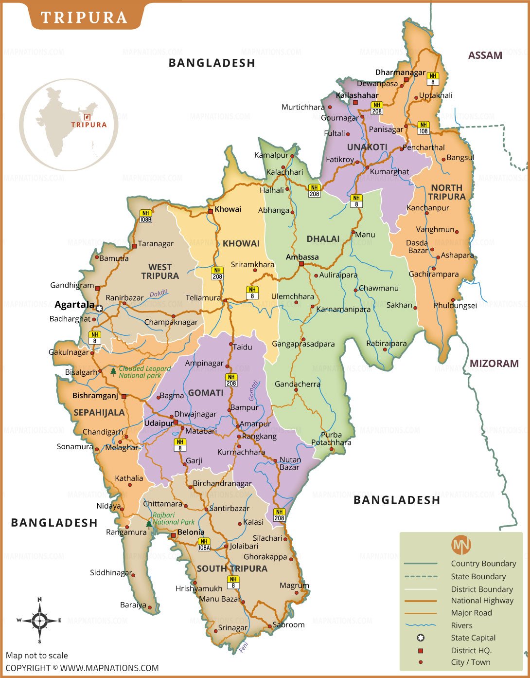This detailed political and administrative map of Tripura highlights district boundaries, major towns, district headquarters, rivers, and national highways. It clearly shows all districts including West Tripura, Sepahijala, Khowai, Gomati, Dhalai, Unakoti, North Tripura, and South Tripura. The map also marks important transport routes such as NH-8 and NH-208, aiding geographic understanding and travel planning. Neighboring regions including Bangladesh, Assam, and Mizoram are clearly labeled, providing valuable regional context. Ideal for students, researchers, planners, and map enthusiasts, this Tripura map offers an accurate and visually organized reference for educational and informational use.