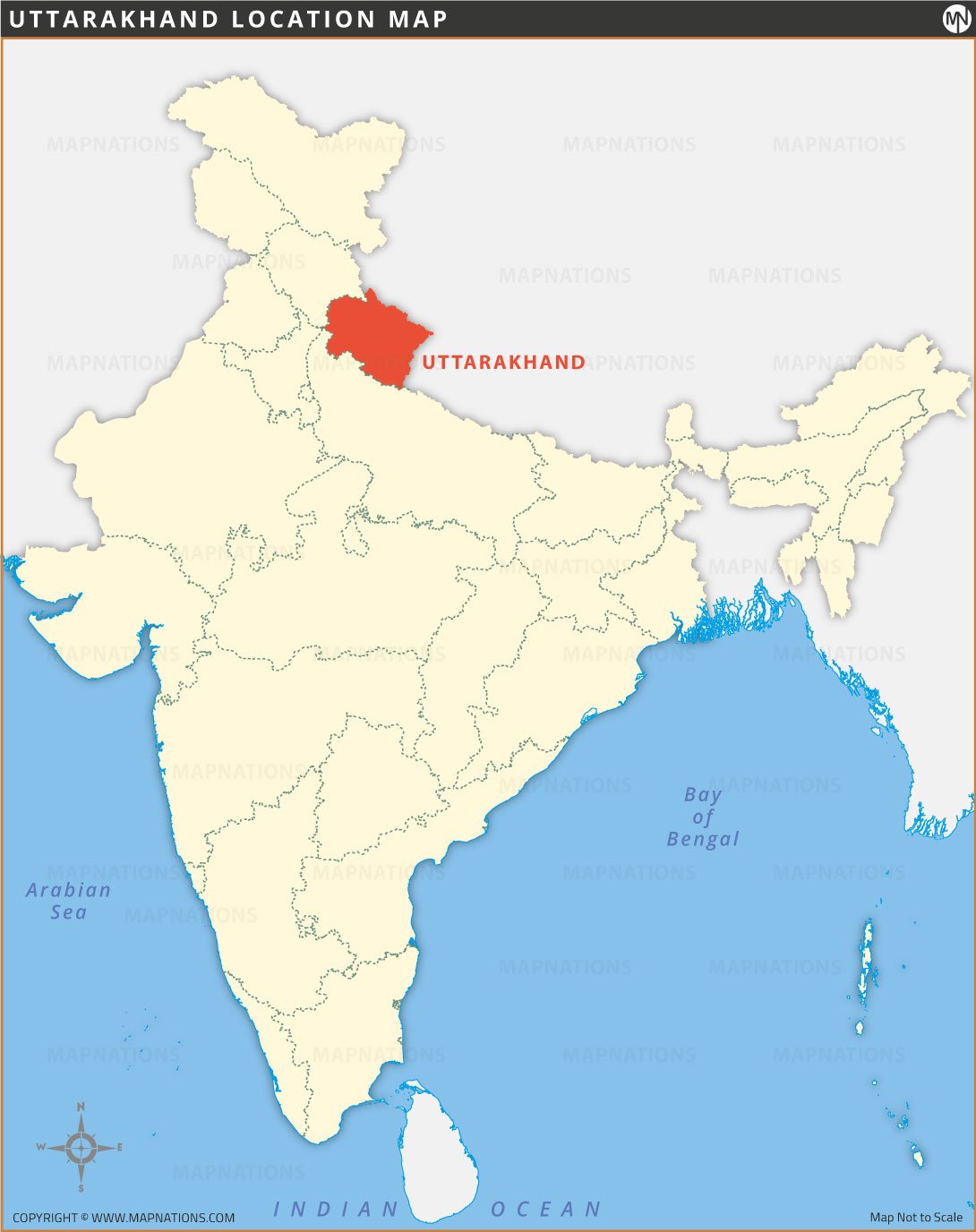 This Uttarakhand location map highlights the state’s position in Northern India. It shares borders with Himachal Pradesh to the northwest, Uttar Pradesh to the south, and international boundaries with China and Nepal. The map clearly shows Uttarakhand’s geographical placement within India, helping users understand its proximity to major regions and neighboring countries. Ideal for educational, geographic, and travel reference, this map offers a simple visual overview of Uttarakhand’s location on the Indian subcontinent.