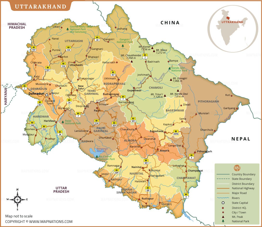Map of Uttarakhand illustrates the state’s districts, national highways, rivers, mountain peaks, and national parks with clarity. The map highlights key cities like Dehradun, Haridwar, Nainital, and Rishikesh, along with important highways such as NH 7, NH 9, and NH 109. It also marks famous peaks like Nanda Devi and Kamet, and renowned parks including Jim Corbett and Nanda Devi National Park. Bordered by Himachal Pradesh, Haryana, Uttar Pradesh, China, and Nepal, Uttarakhand is known for its diverse geography ranging from the Gangetic plains to the majestic Himalayas. This Uttarakhand map serves as a valuable resource for travelers, students, and researchers interested in the topography and administrative divisions of the state.