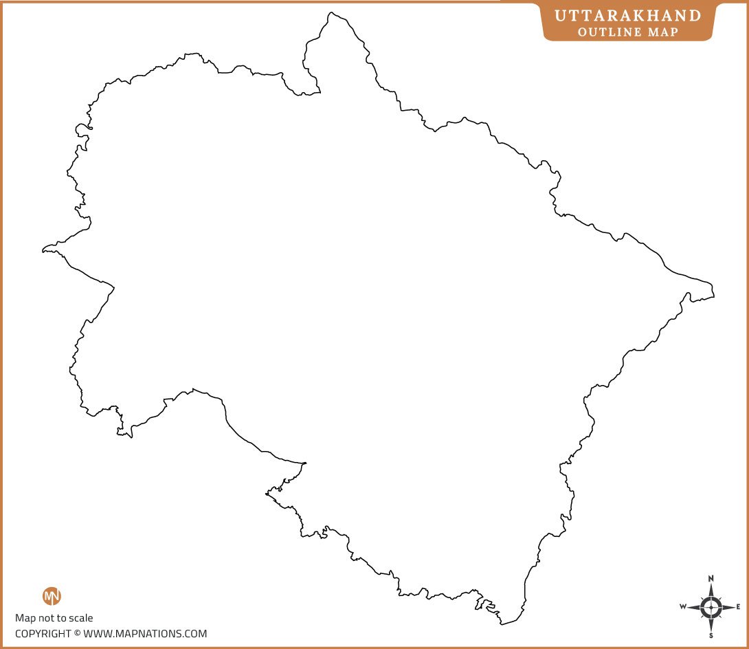 Uttarakhand maps provide essential resources for educational, administrative, and geographic purposes. The outline map shows the state's outer boundary, ideal for drawing or marking locations. The blank map displays district divisions, aiding in detailed study, district identification, and custom map creation for classroom or research use.