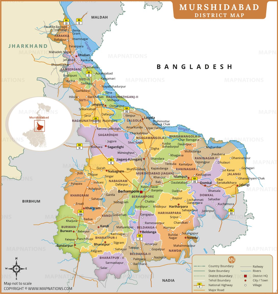 Murshidabad District Map illustrates administrative divisions, blocks, towns, transportation routes, and major rivers within the district of West Bengal, India. The map highlights important locations such as Berhampore, Jangipur, Lalbagh, Kandi, and Domkal, along with national highways and railway connections. It also shows the international boundary with Bangladesh and neighboring districts including Malda, Birbhum, and Nadia. Major rivers like the Ganges and Bhagirathi are clearly marked, helping users understand regional geography. This map is useful for educational, planning, and reference purposes, providing a comprehensive overview of Murshidabad’s political and geographic layout with clearly defined administrative boundaries and settlement distribution across the district.