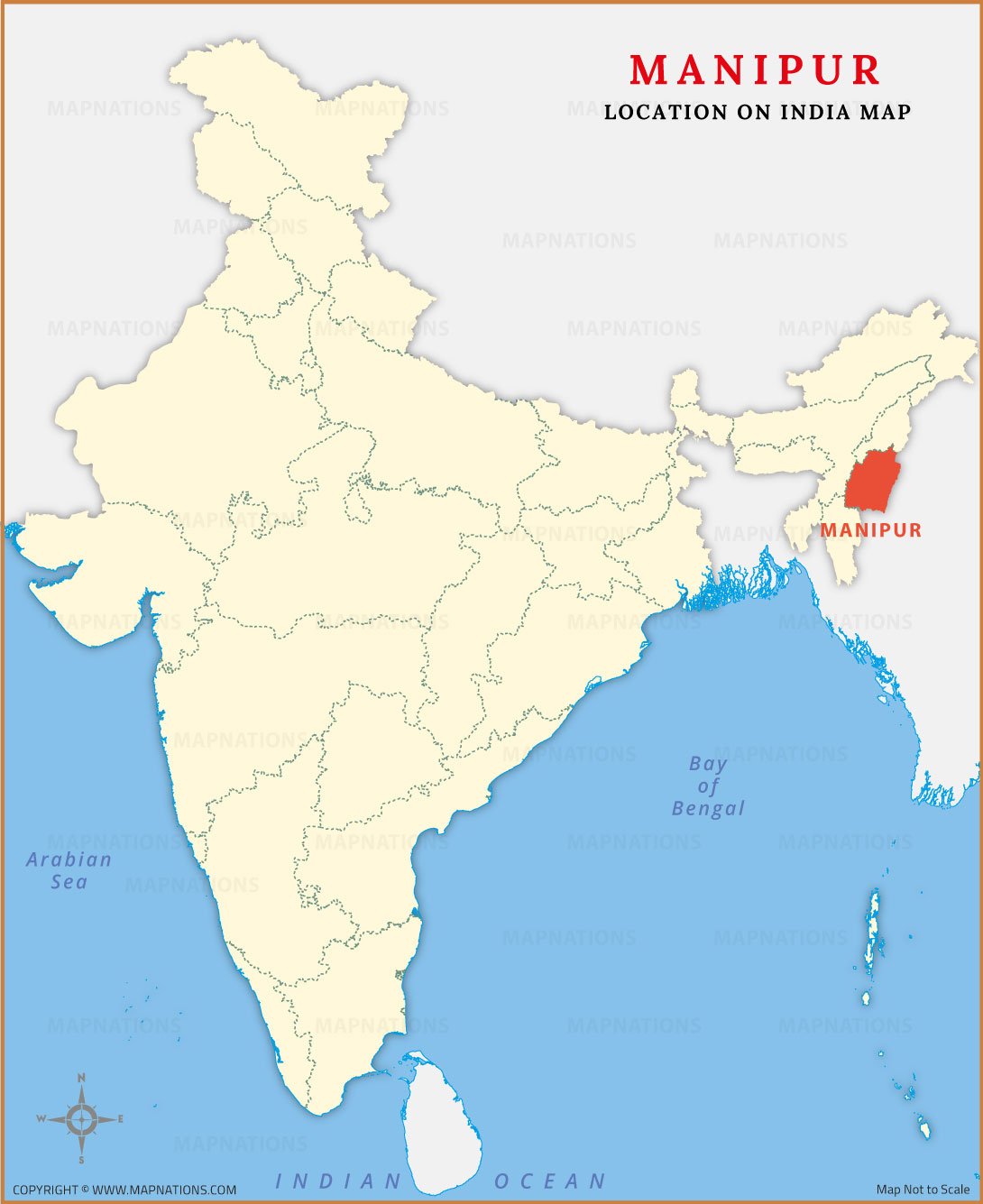 This location map clearly shows where Manipur is situated on the map of India. Highlighted in Northeast India, Manipur lies near the eastern edge of the country and shares borders with Nagaland, Assam, Mizoram, and the international boundary with Myanmar. The map helps viewers easily identify Manipur’s geographic position within India, making it useful for students, travelers, and general reference to understand the state’s regional context.