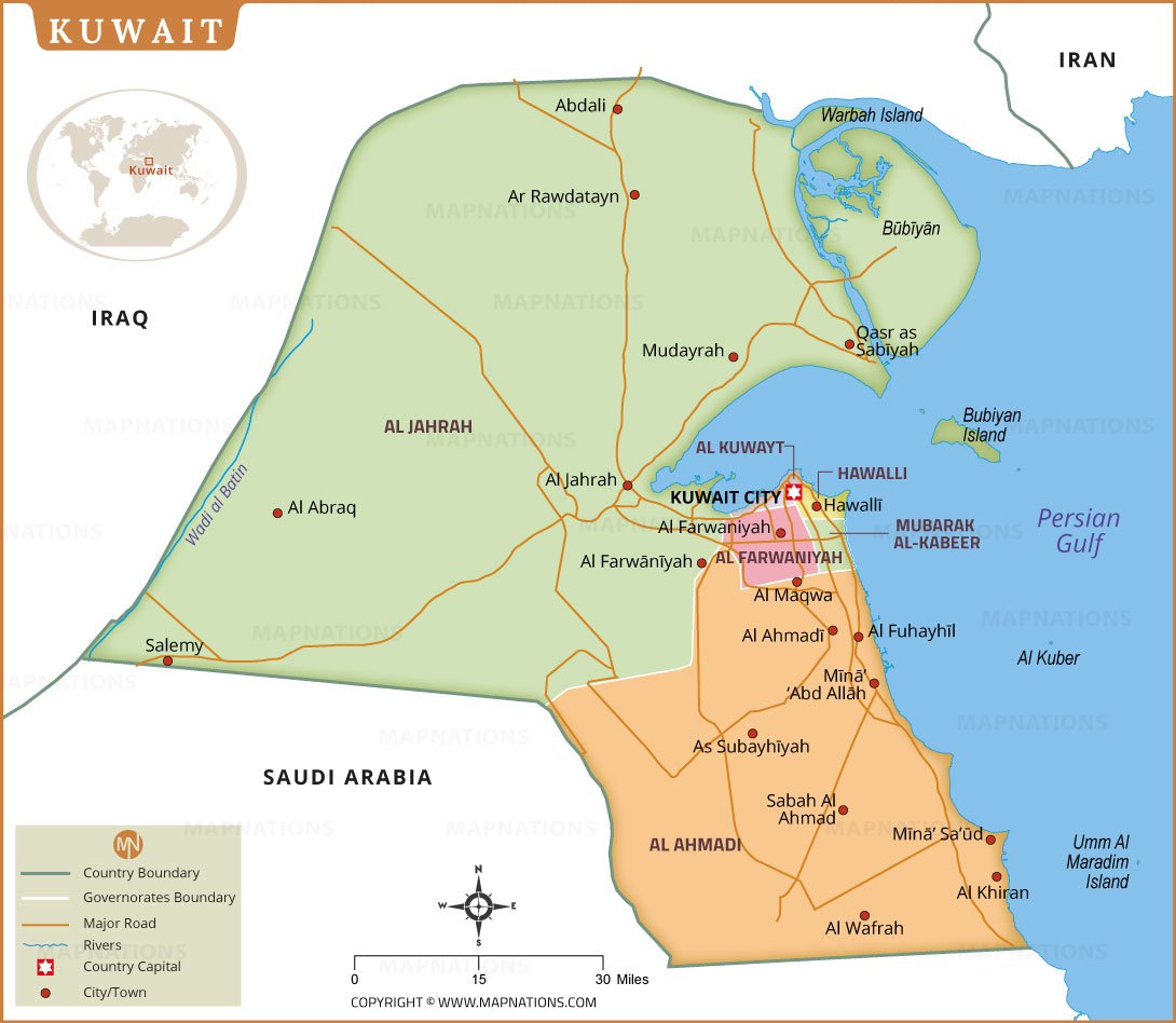 This detailed map of Kuwait highlights national boundaries, governorates, major cities, road networks, and coastal features along the Persian Gulf. It clearly displays key urban centers including Kuwait City, Al Farwaniyah, Hawalli, Al Ahmadi, and Jahrah, helping users understand administrative divisions and regional connectivity. The map also marks important islands such as Bubiyan and Warbah, along with neighboring countries Iraq, Saudi Arabia, and Iran. Designed for students, travelers, researchers, and educators, this Kuwait map provides accurate geographic reference, making it suitable for academic use, presentations, tourism planning, and general geographic awareness.