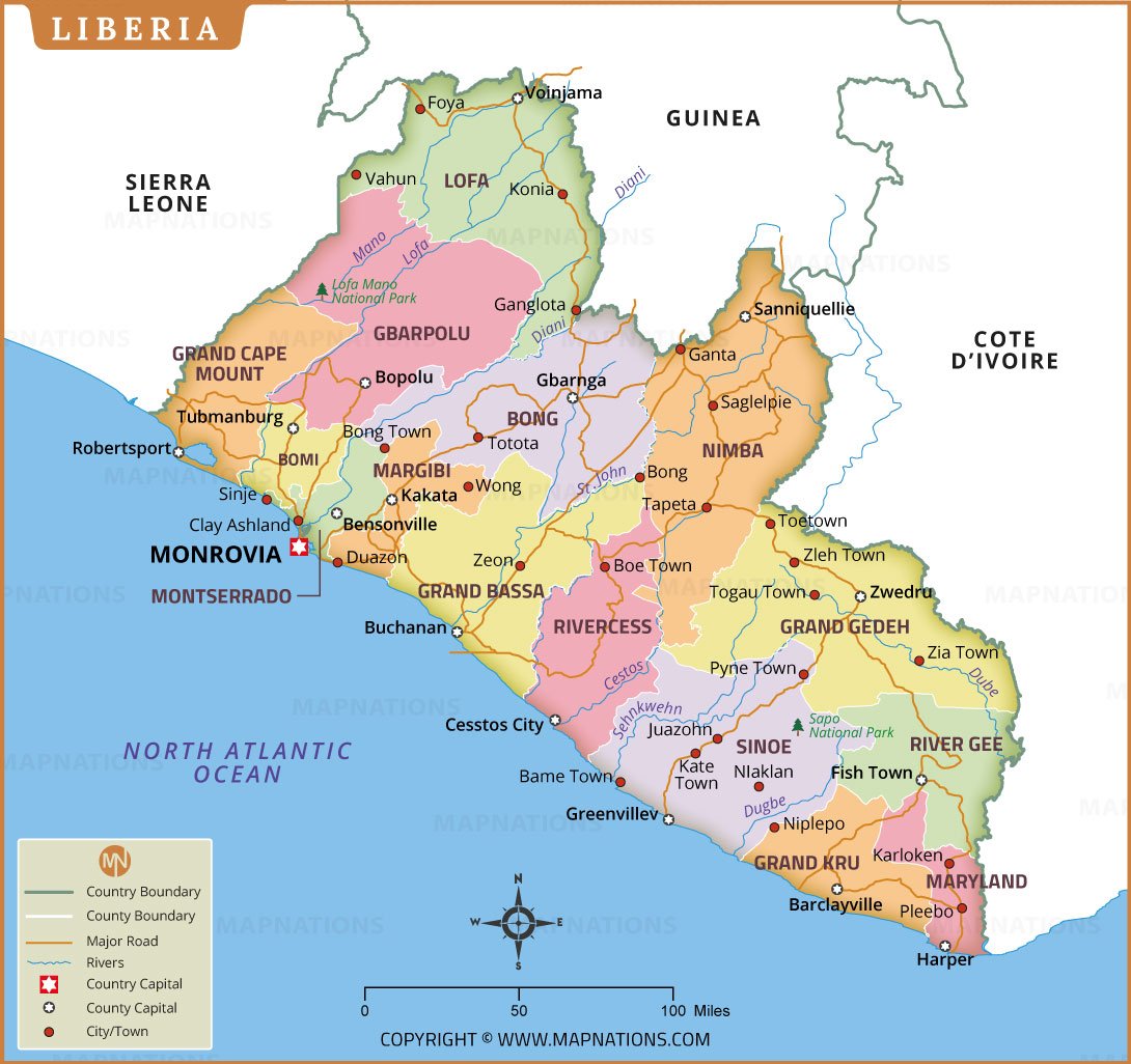 This detailed map of Liberia highlights the country’s administrative counties, major cities, towns, road networks, and river systems. It clearly marks county boundaries, county capitals, and the national capital, Monrovia, along the Atlantic coast. Neighboring countries including Sierra Leone, Guinea, and Côte d’Ivoire are shown for geographic context. Important natural features such as major rivers and national parks are labeled, making the map useful for education, research, planning, and general reference. The clear color coding and readable labels make it ideal for students, travelers, and map enthusiasts.