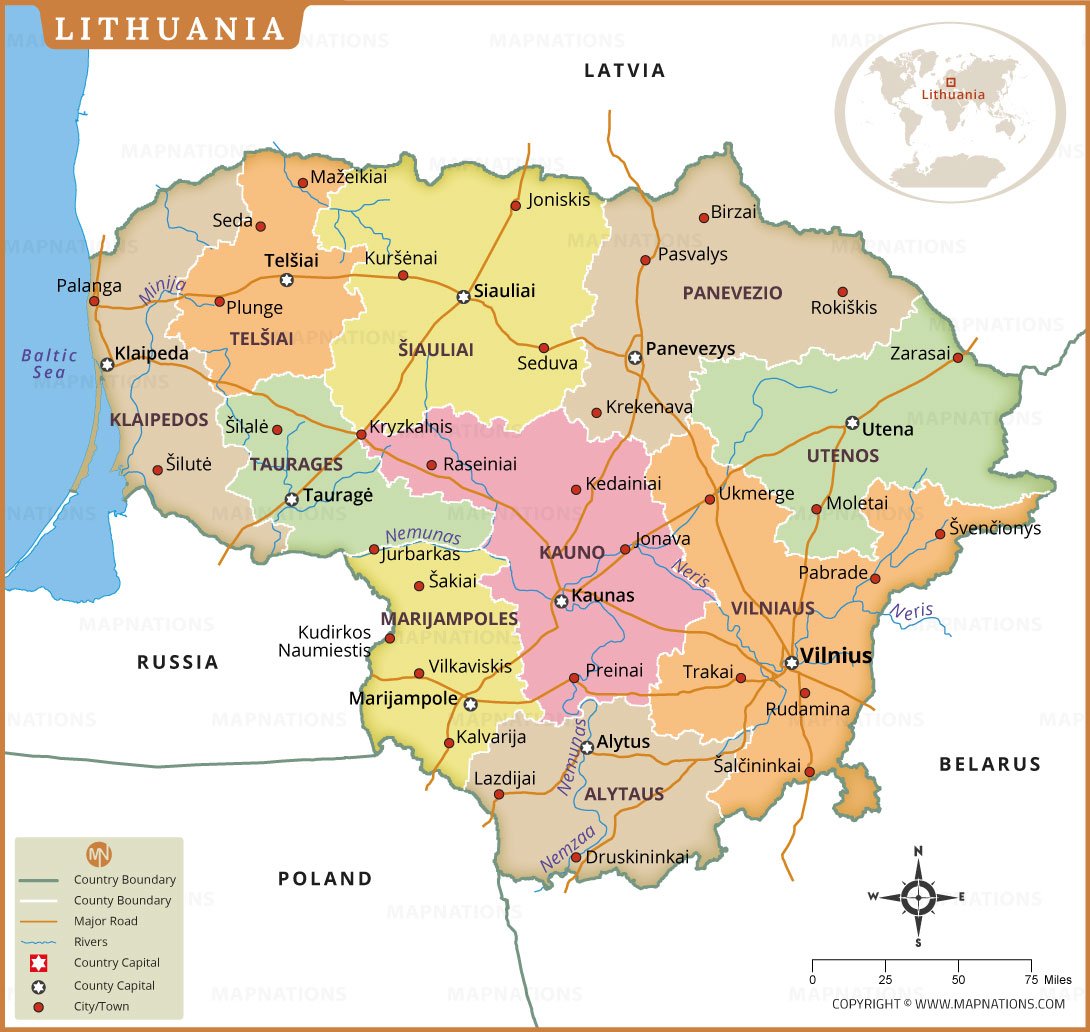 This administrative map of Lithuania presents a clear overview of the country’s counties, major cities, towns, and transport routes. It highlights key urban centers such as Vilnius, Kaunas, Klaipėda, Šiauliai, and Panevėžys, along with important rivers, including the Nemunas and Neris. Distinct county boundaries and color differentiation make regional identification easy, while international borders with Latvia, Belarus, Poland, and Russia are clearly marked for geographic context.
