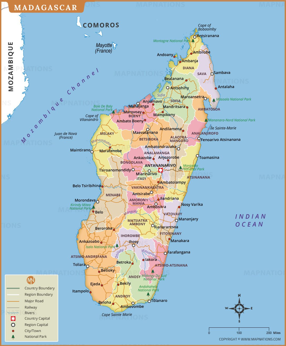 Madagascar political map displaying regional boundaries, major cities, transportation routes, rivers and national parks across the island nation in the Indian Ocean. The map highlights the capital Antananarivo along with important urban centers such as Toamasina, Mahajanga and Toliara. Color coded regions help viewers easily understand administrative divisions while roads and railways illustrate connectivity across the country. Coastal features, nearby islands and surrounding waters including the Mozambique Channel are clearly labeled, making this map useful for education, travel planning, research and geographic reference about Madagascar and its diverse landscapes, ecosystems and settlements across the island nation of Africa today map.
