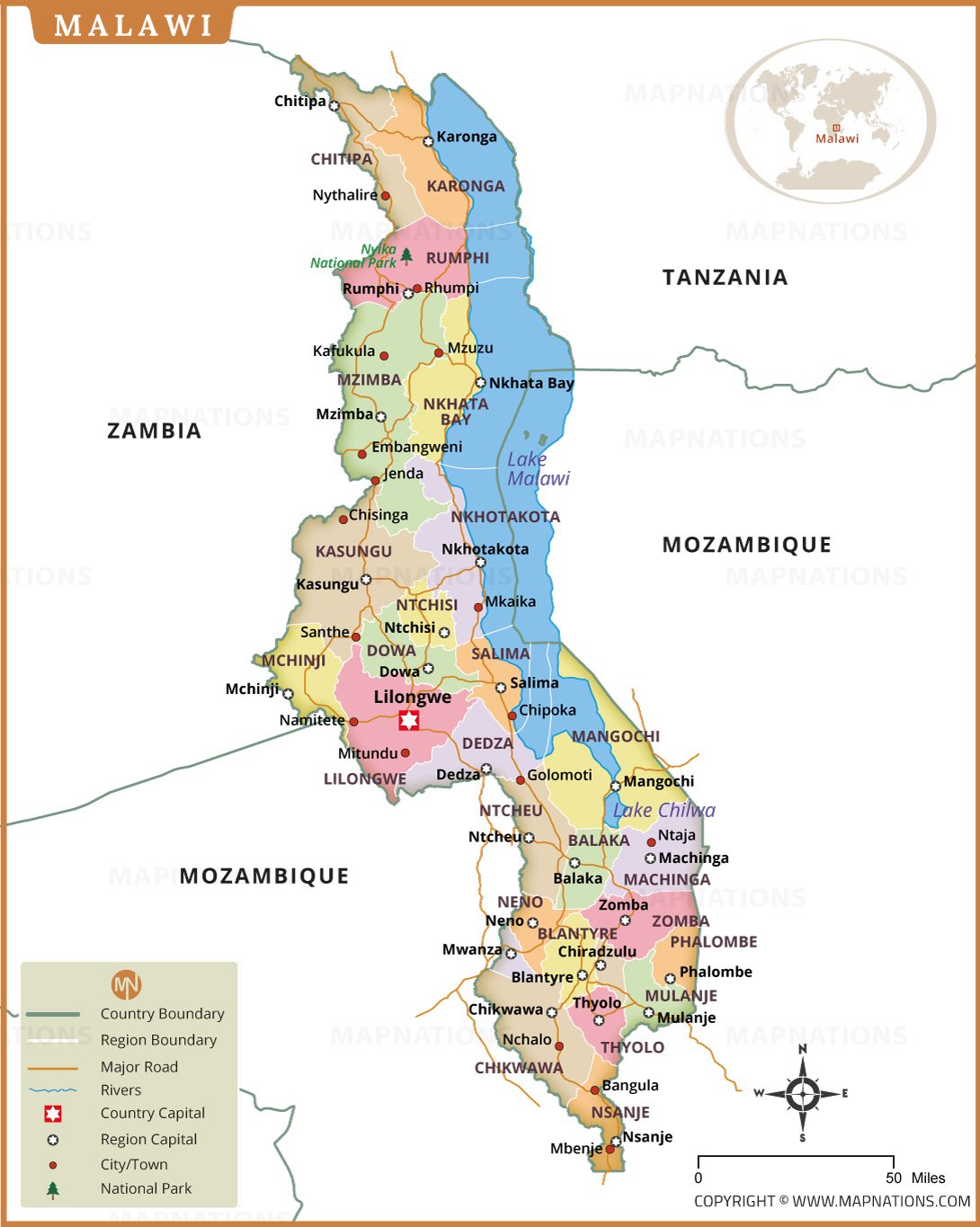 This detailed map of Malawi highlights district boundaries, major cities, roads, and important natural features. The capital city Lilongwe is clearly marked, along with major urban centers such as Blantyre, Mzuzu, and Zomba. The map also prominently displays Lake Malawi, one of Africa’s largest freshwater lakes stretching along the country’s eastern border. Neighboring countries including Tanzania, Mozambique, and Zambia are labeled. This map is useful for geographic study, travel planning, and educational reference.