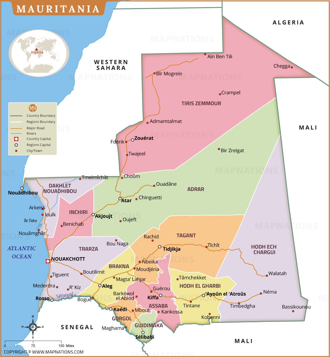 This detailed map of Mauritania presents a clear view of the country’s administrative regions, regional capitals, major cities, and transport network. It highlights important regions such as Tiris Zemmour, Adrar, Tagant, Brakna, Trarza, Assaba, and Hodh El Gharbi, along with key cities including Nouakchott, Nouadhibou, Atar, Kiffa, and Zouerate. Major roads, rivers, and international borders with Western Sahara, Algeria, Mali, and Senegal are clearly marked. An inset location map helps identify Mauritania’s position in Africa, making this map useful for education, reference, and geographic analysis.