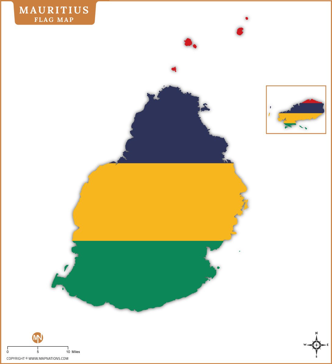 This flag map of Mauritius creatively blends the country’s geographic outline with its national flag colors—red, blue, yellow, and green. The design symbolically represents Mauritian identity, unity, and pride while maintaining a clear island silhouette. An inset further emphasizes the flag pattern within the national shape. Ideal for educational use, presentations, posters, and digital content, this map offers a visually striking way to showcase Mauritius’s national symbolism and geographic form together.