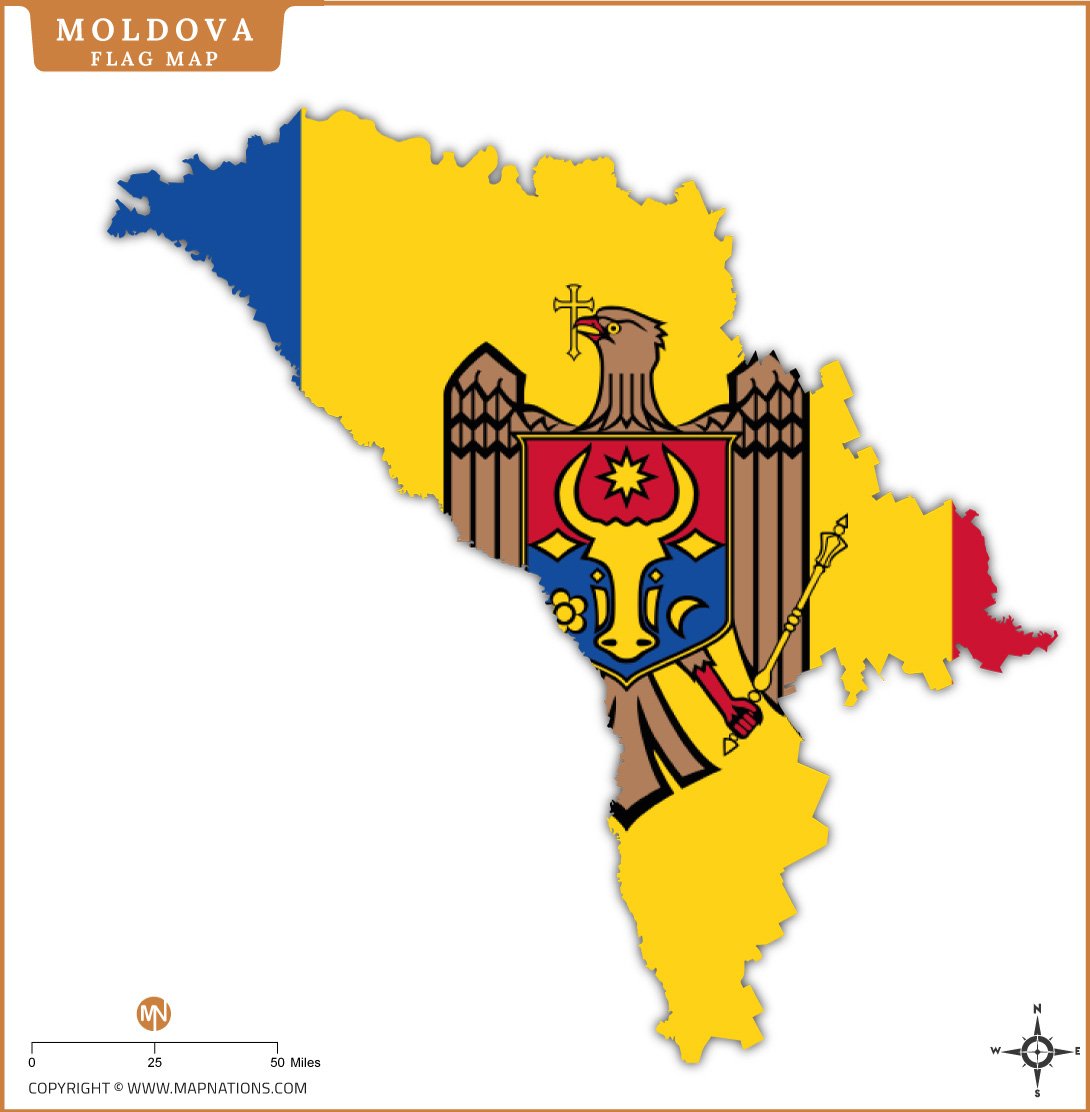 This Moldova flag map artistically combines the national flag with the country’s geographic shape, showcasing Moldova’s identity and national pride. The map features the blue, yellow, and red vertical stripes of the Moldovan flag, along with the central coat of arms displaying an eagle holding a cross, scepter, and olive branch. The emblem also includes a shield with an aurochs head symbolizing strength and independence. This design elegantly merges geography with symbolism, representing Moldova’s unity, culture, and sovereignty. Perfect for educational, historical, or cultural presentations, this flag map offers a unique visual perspective of Moldova’s national heritage and location within Eastern Europe.