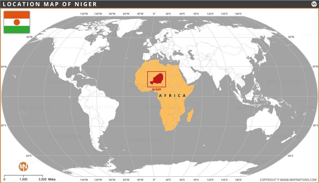 This location map clearly shows where Niger is situated within Africa and the global context. Highlighted against the African continent, Niger appears in West Africa, emphasizing its landlocked position and regional importance. The world map background helps viewers understand Niger’s relative location to other continents and oceans. This map is useful for students, educators, researchers, and travelers seeking quick geographic orientation, spatial awareness, and visual reference for academic, informational, and presentation purposes.