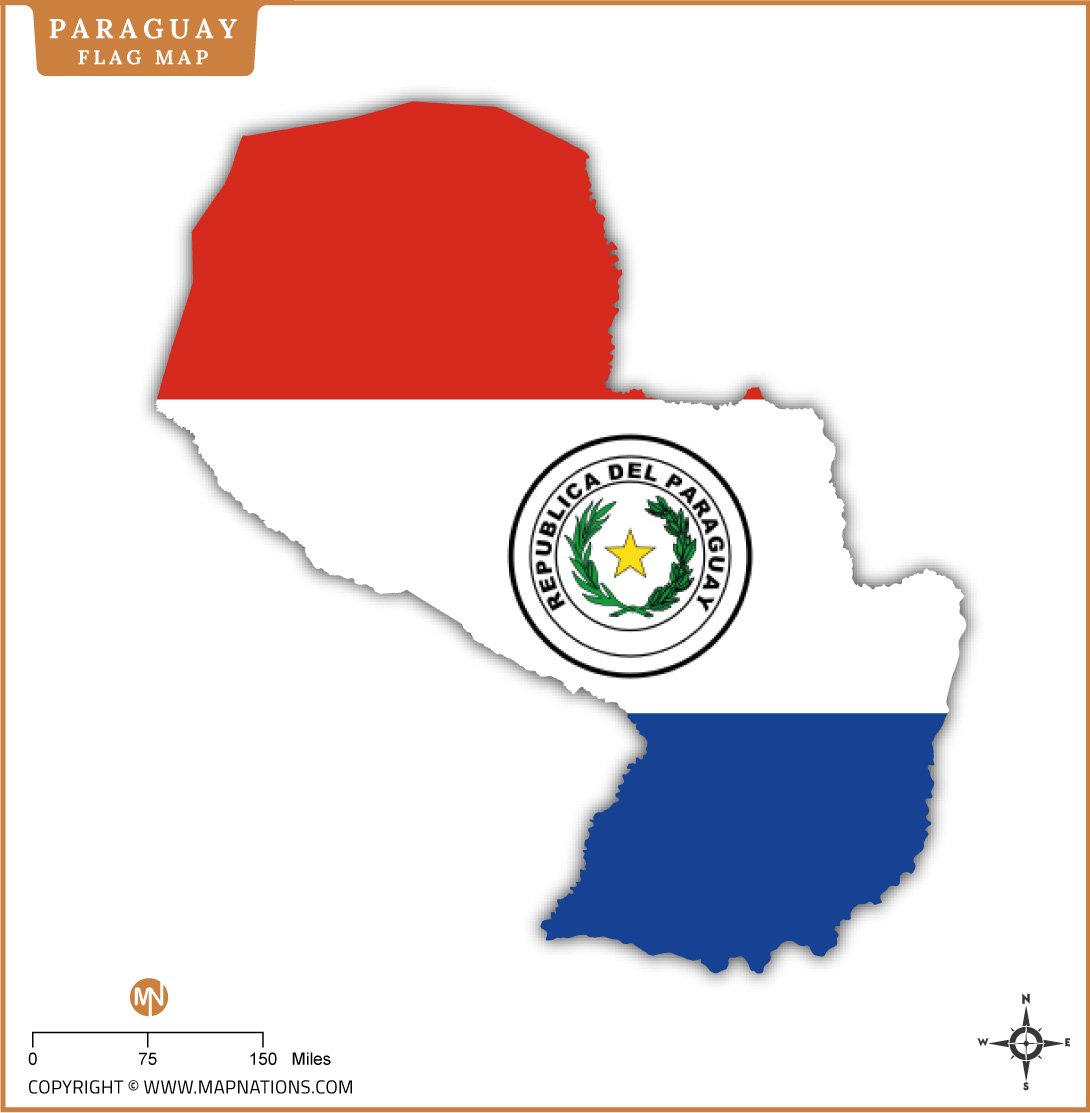 This Paraguay flag map creatively combines the national outline with the red, white, and blue tricolor and official emblem. It visually represents Paraguay’s national identity, unity, and sovereignty through cartographic symbolism. The clean background and clear country shape make the map ideal for educational materials, presentations, posters, and digital content. It helps viewers associate the national flag with Paraguay’s geographic form, useful for students, educators, designers, and general reference in classrooms, media, and creative projects.