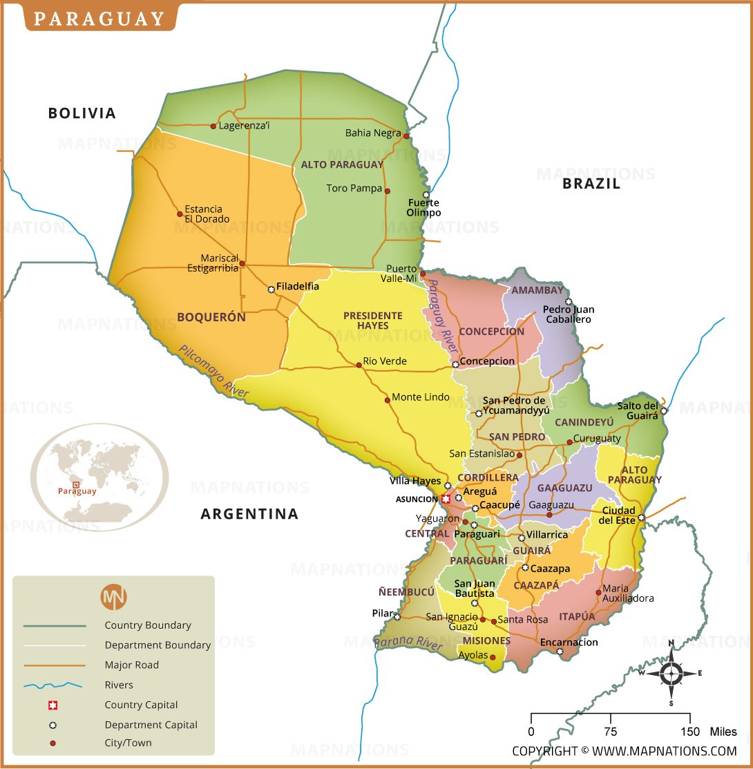 This detailed map of Paraguay presents the country’s administrative divisions, clearly highlighting all departments, their capitals, major cities, rivers, and transport routes. International boundaries with Argentina, Brazil, and Bolivia are marked, helping viewers understand Paraguay’s regional position in South America. The map also emphasizes important rivers such as the Paraguay and Paraná, which shape settlement and trade patterns. Color differentiation improves readability, making each department easy to identify. This map is ideal for students, researchers, travelers, and map enthusiasts seeking a clear political and geographic overview of Paraguay at multiple scales for general reference use in classrooms and digital publications.