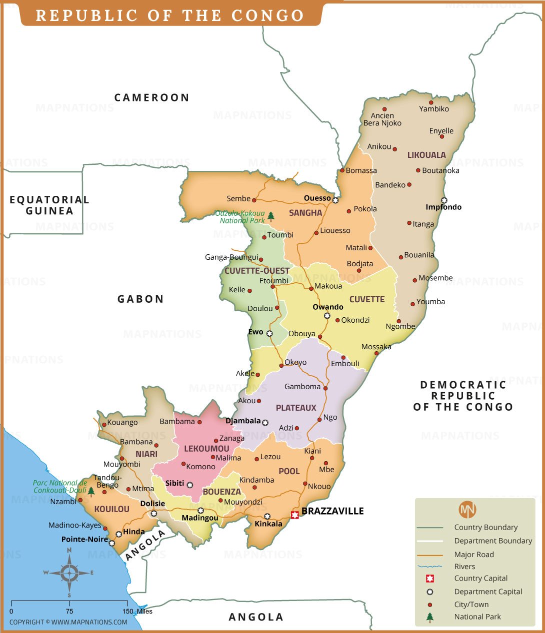 This detailed political map of the Republic of the Congo highlights its twelve departments including Sangha, Likouala, Cuvette, Plateaux and Kouilou. Major cities such as Brazzaville, Pointe-Noire, Owando and Impfondo are marked along with department capitals, key roads, rivers and protected areas like Odzala-Kokoua National Park. The map also shows international boundaries with neighboring countries including Gabon, Cameroon, Central African Republic, Democratic Republic of the Congo and Angola. Clear color divisions help readers easily identify administrative regions and understand the country’s geographic layout within Central Africa. It serves as a useful reference for geography education, travel planning and regional analysis.