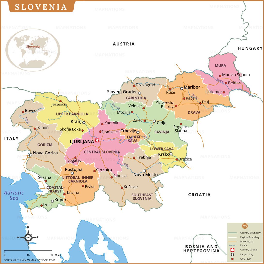Situated in Central Europe, Slovenia shares borders with Austria, Italy, Hungary, and Croatia, and has a short but significant Adriatic Sea coastline. This map is ideal for educational use, travel planning, and general reference, offering valuable insight into Slovenia’s geographic structure, regional layout, and strategic location within Europe.