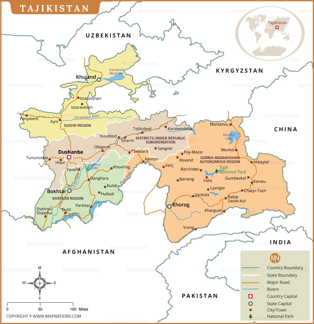 This detailed political map of Tajikistan highlights its administrative divisions, including Sughd Region, Khatlon Region, Districts under Republic Subordination, and Gorno-Badakhshan Autonomous Region. The capital city, Dushanbe, is clearly marked along with other important cities such as Khujand, Bokhtar, and Khorog. Major roads connect urban centers, providing insight into the country’s transportation network, while rivers like the Zeravshan and Panj are prominently displayed, emphasizing the nation’s geography.