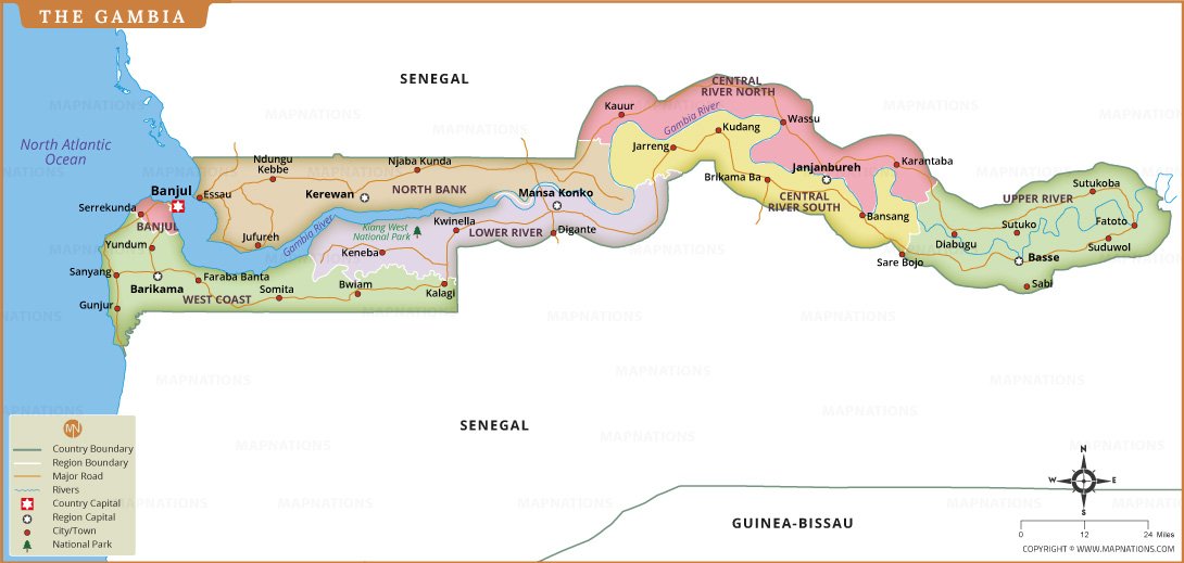This detailed map of The Gambia illustrates the country's administrative regions, major cities, transportation routes, and the winding Gambia River. The capital city Banjul appears near the Atlantic coast, while towns such as Brikama, Basse, and Janjanbureh are clearly marked. Regional divisions including West Coast, North Bank, Lower River, Central River, and Upper River are labeled for geographic reference. The map also highlights surrounding borders with Senegal and Guinea-Bissau, helping readers understand the country's narrow east-west shape along the river corridor in West Africa, making it useful for education, travel, and regional planning purposes and general geographic reference and study.