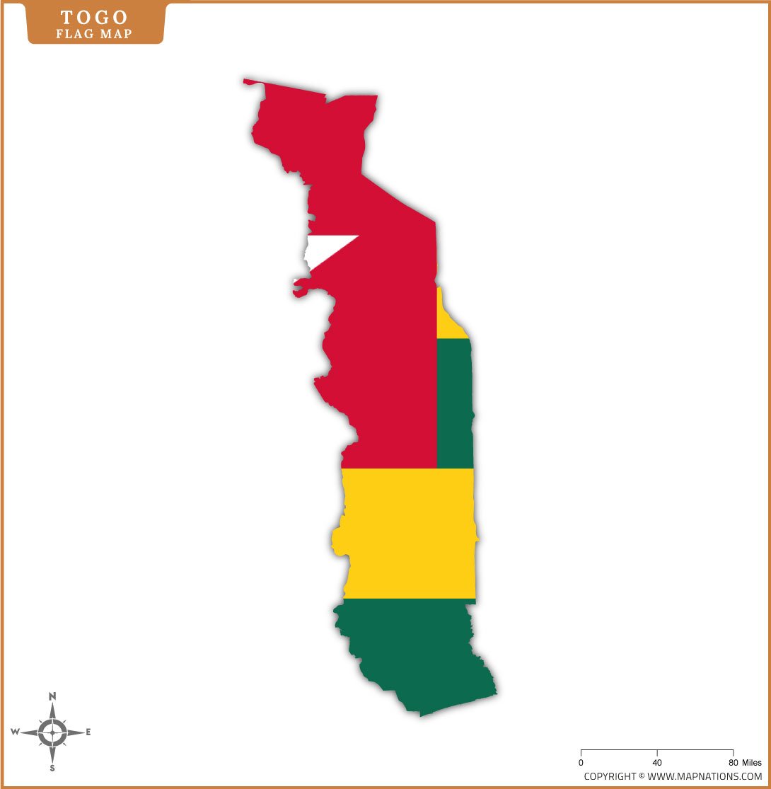 This Togo flag map creatively combines the country’s geographic outline with its national flag colors, offering a visually striking representation of identity and territory. The red, yellow, and green elements symbolize unity, natural wealth, and hope, while the white star reflects peace. Designed for educational and decorative purposes, this map highlights Togo’s unique shape in West Africa. It serves as an engaging visual tool for geography enthusiasts, students, and map collectors alike.